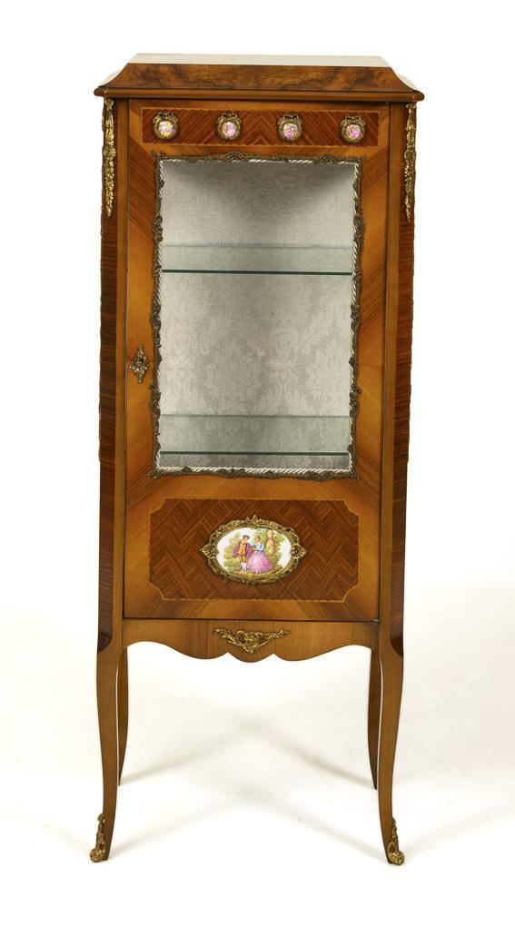 Elegante 3-seitig verglaste Pfeilervitrine auf 4 leicht ausgestellten Beinen, üppig verziert mit Rocaillen-Messingbändern, 8 Porzellanplaketten mit bedruckten Szenen der "Fêtes Galantes" und Fischgrätmarketerie; Rückwand innen mit hellem Stoff verkleidet, 2 Einlegeböden aus Glas. Tür schließt nicht, minimale Alters-/Gebrauchsspuren.