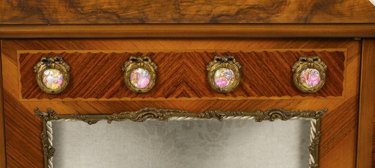 Zierliche Vitrine im Rokoko-Stil mit Porzellanplaketten.