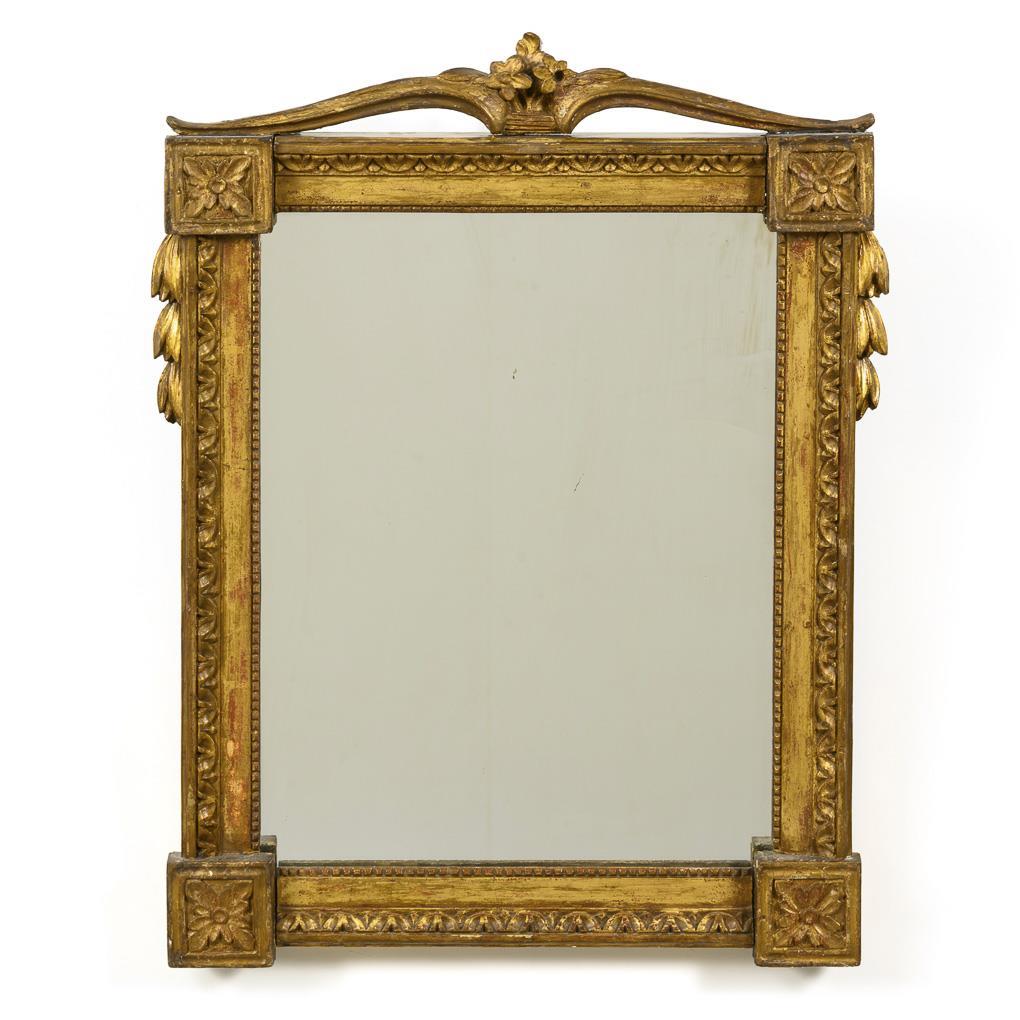Kleiner rechteckiger Wandspiegel mit dezent floral geschnitzter Bekrönung und reliefiertem Rahmen. Alters-/Gebrauchsspuren, Spiegelglas ergänzt, Vergoldung berieben.