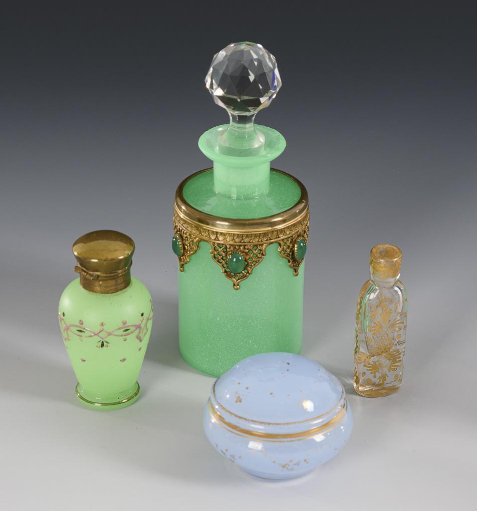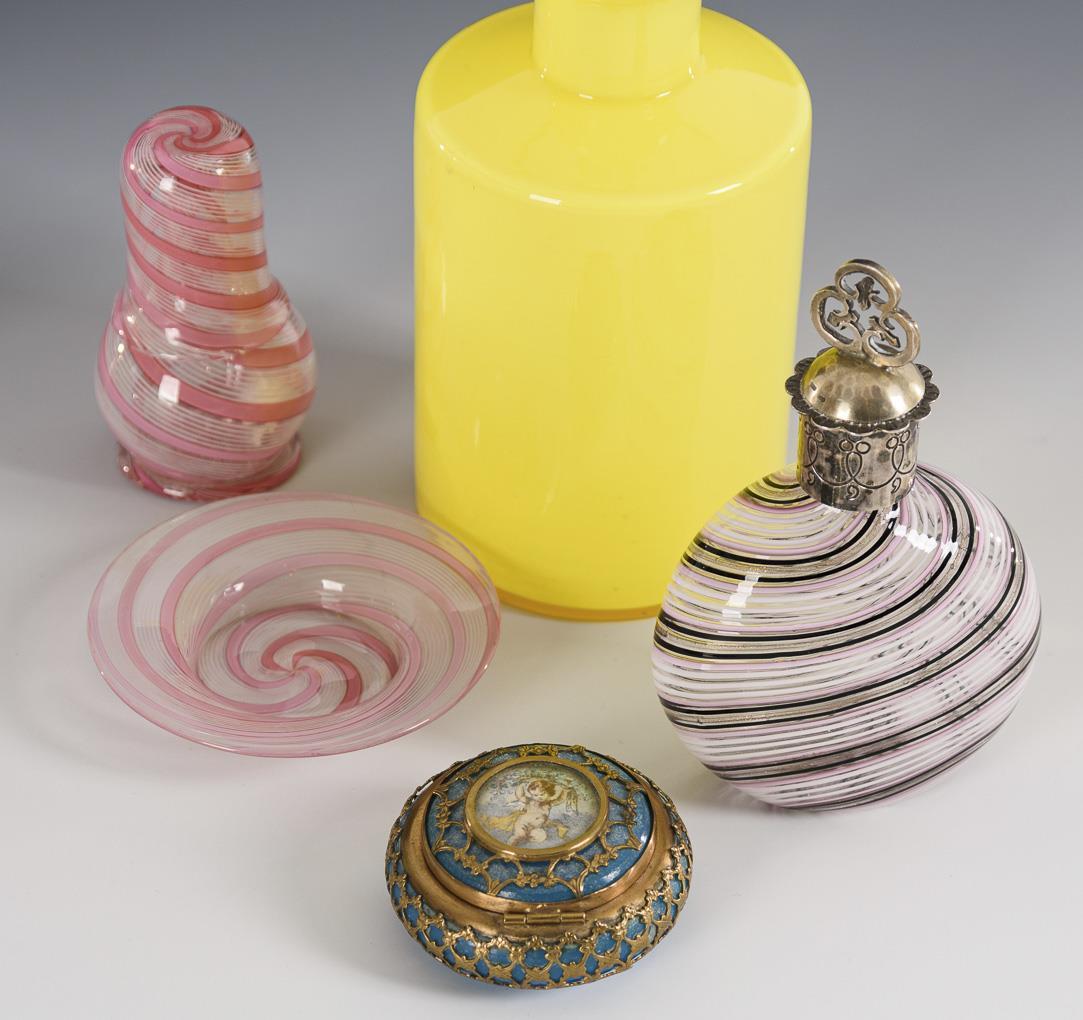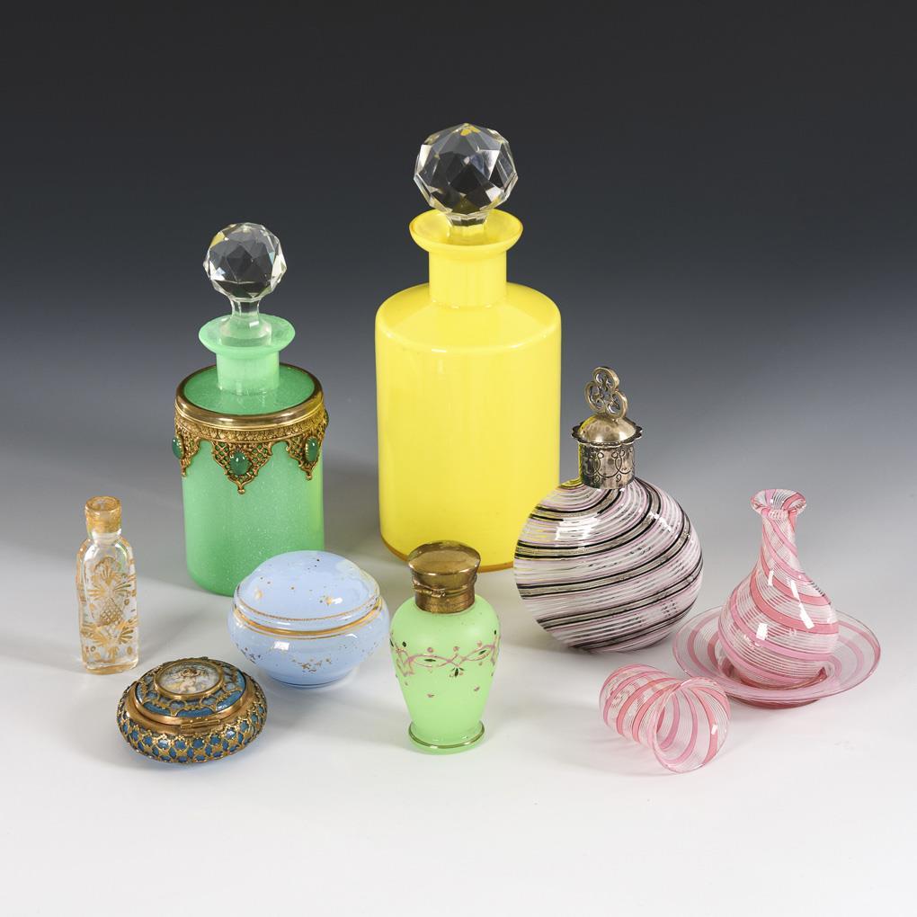 1x Miniaturkaraffe aus farblosem Glas mit eingeschmolzenen weißen Fäden und rosa Faden, Murano: Karaffe (H 7,5 cm), Becher (H 4,5 cm) und Teller (Ø 8 cm). / 2 Zylinderkaraffen: 1x aus farblosem Glas mit opalgelbem Innenfang (H 18,5 cm) und 1x aus grünem Alabasterglas mit Metallmontierung (H 15 cm). / 3 Flakons: Fadenglasflakon mit Silbermontierung (gepunzt; H 11,5 cm), Balusterflakon aus hellgrünem Alabasterglas mit Emailmalerei und Metallmontierung (H 8 cm), kleiner Flakon aus farblosem Glas mit Facettenschliff und Goldmalerei (dieser wohl 18. Jh.; H 7 cm). / 2 Döschen: 1x aus hellblauem Alabasterglas mit Goldmalerei (Ø 6,3 cm) und 1x aus blauem Alabasterglas mit Metallmontierung und einem Puttenbild auf dem Deckel (Ø 6,5 cm). Stopfen der Karaffen wohl ergänzt, Karaffenränder und 1 Döschenrand bestoßen.