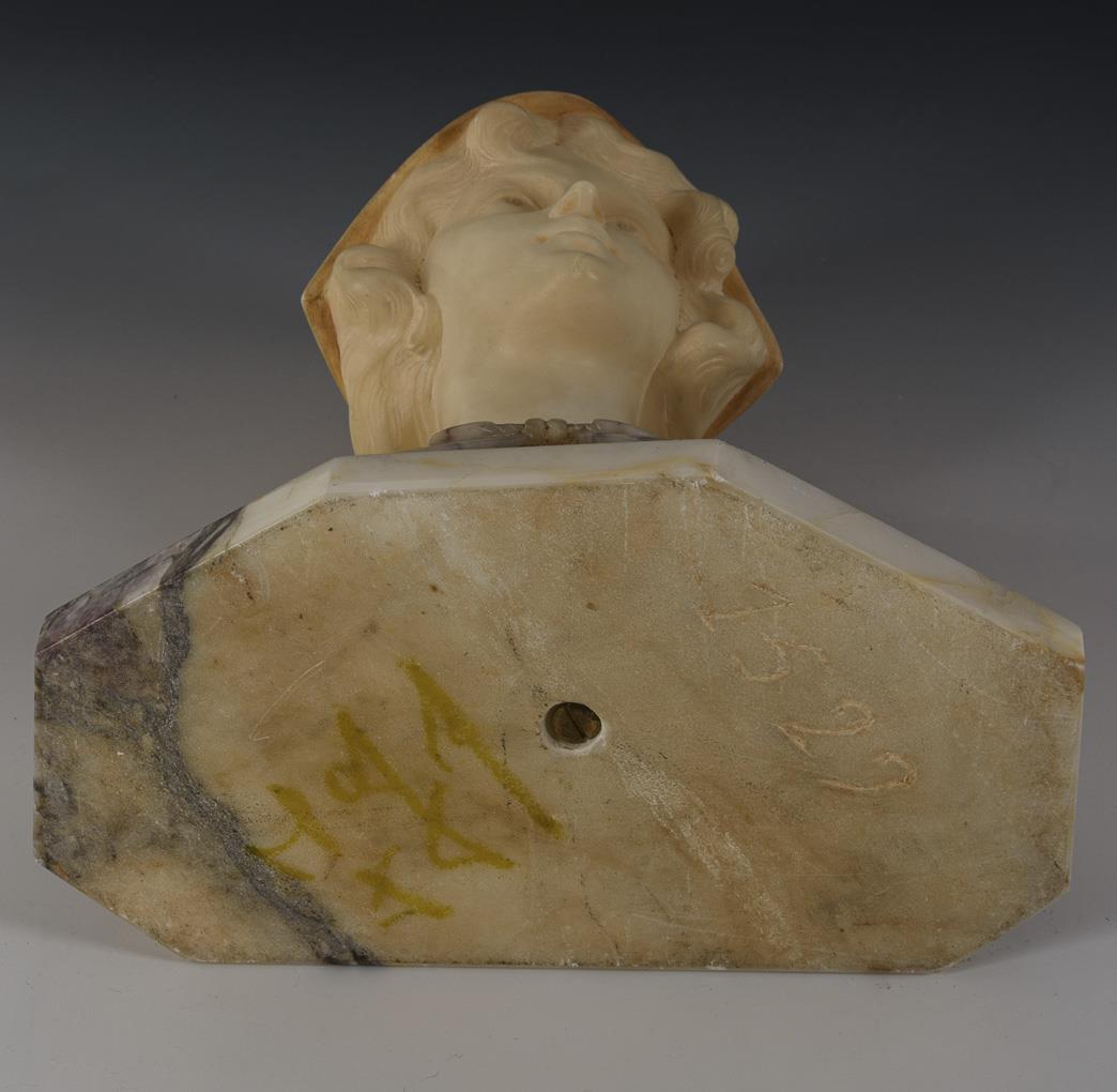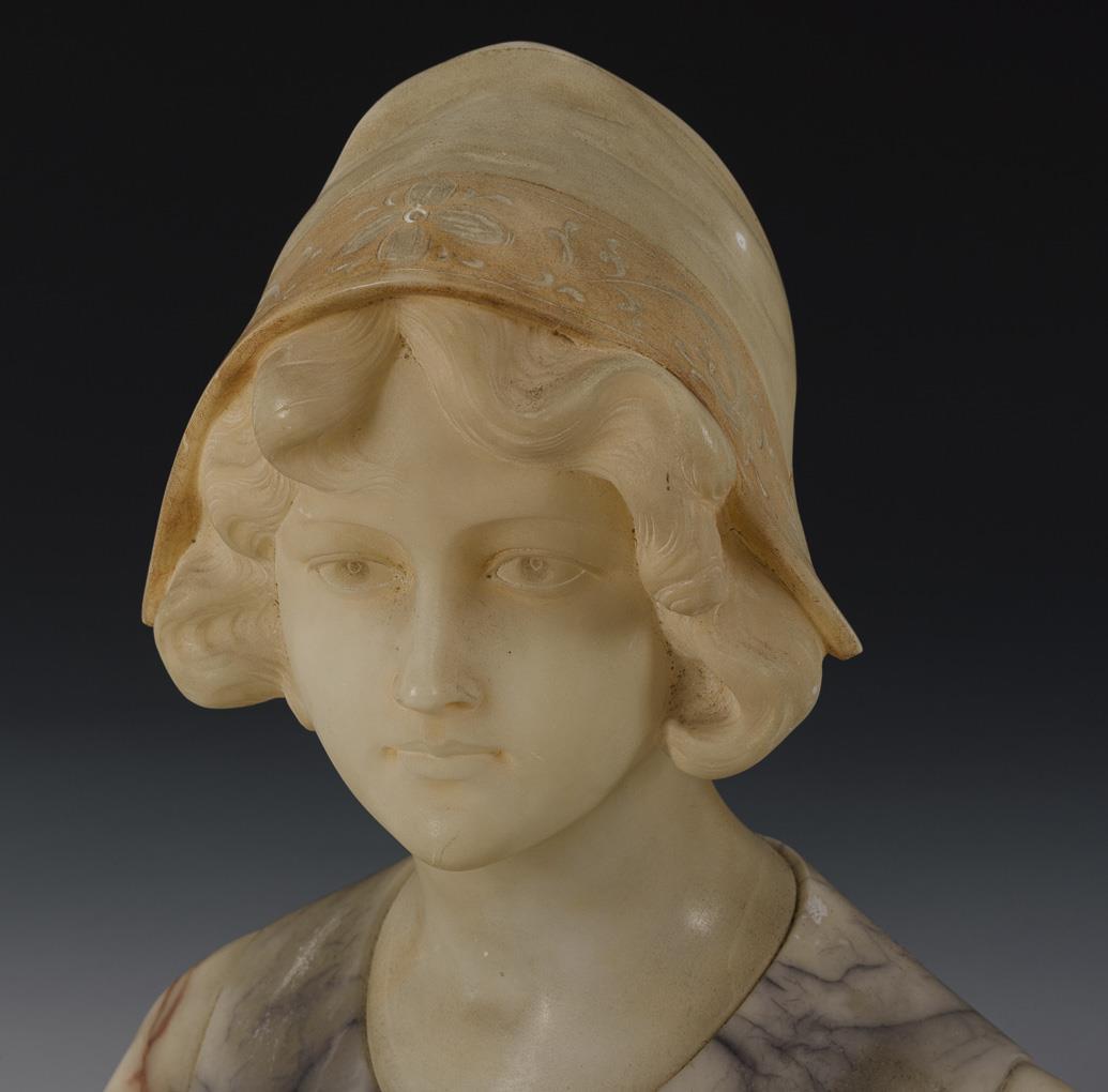 Alabaster teils eingefärbt, helle Marmor-Plinthe. Signiert, unterseitig eingeritzte Nr. 29 x 27 x 14,5 cm. 8,3 kg.