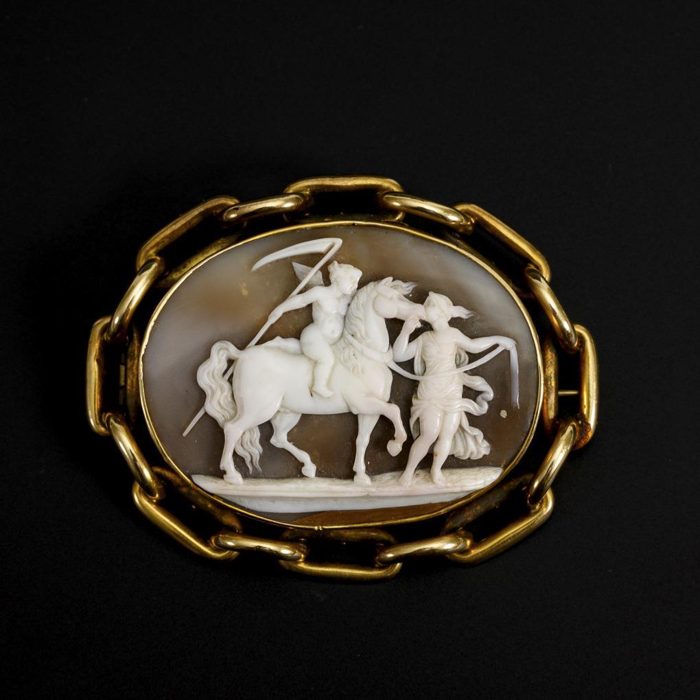 Zargengefasste Kamee mit antikisiertend geschnittenem Motiv "Der Titan Kronos (Saturn) in Gestalt eines Pferdes, liebkost Philyra, währenddessen der Erosknabe auf seinem Rücken die Sense hält" in reliefiertem Kettenrahmen. Hakenverschluss, kleine Öse. Seitlich kleine Haarrisse.