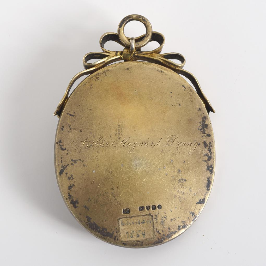 Bildnisrelief des "Arthur Maynard Denny" (1823-1900) im Silberrahmen mit Schleifenbekrönung und Hängeöse sowie verso Namensgravur. / Porträt eines jungen Mannes im Leistenrahmen. 1x Porzellan etwas gebräunt und geringe Farbschäden am Glasträger und Rahmen.
