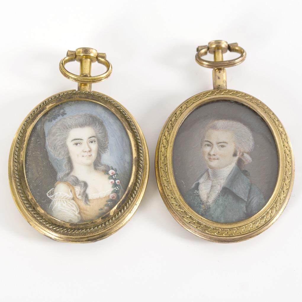 Frau mit Girlande als Schärpe bzw. junger Mann; beide ähnlich gerahmt. Damenbildnis verso mit gemaltem Freundschaftstempel im Zierrahmen; Herrenbildnis verso mit Palmetteneinlage. Palmetteneinlage jünger ergänzt.