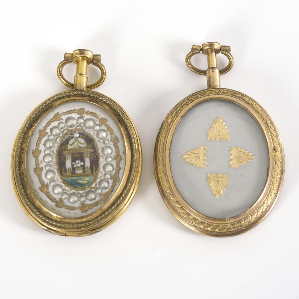 Frau mit Girlande als Schärpe bzw. junger Mann; beide ähnlich gerahmt. Damenbildnis verso mit gemaltem Freundschaftstempel im Zierrahmen; Herrenbildnis verso mit Palmetteneinlage. Palmetteneinlage jünger ergänzt.