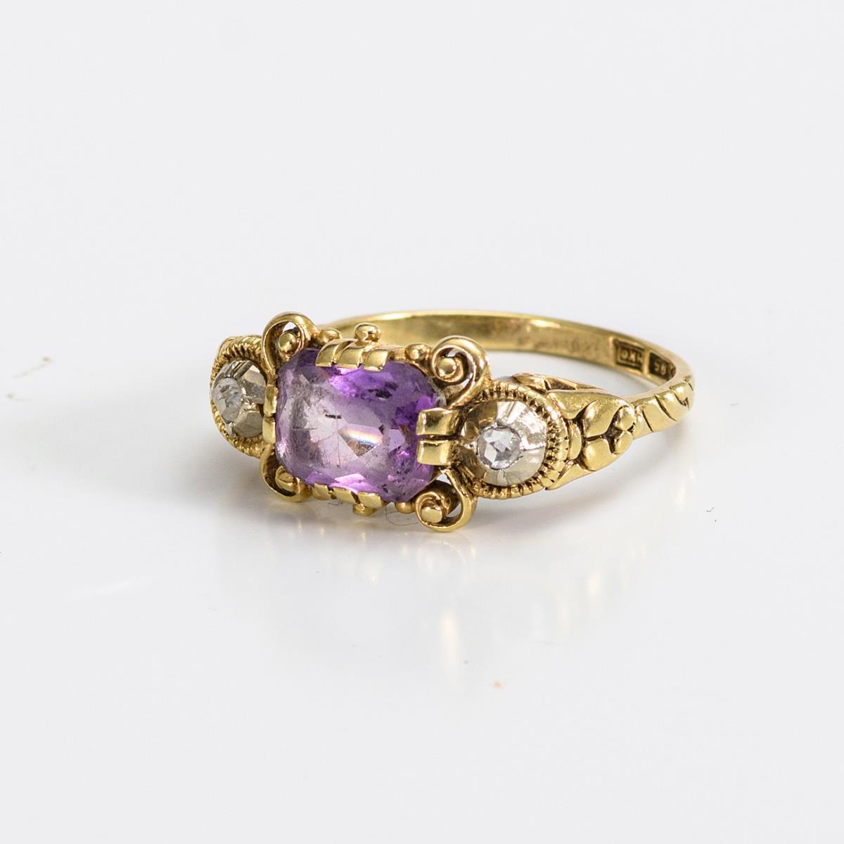 Heller Amethyst (Facettenkanten berieben) und 2 Diamantrosen in verziertem Ringkopf.