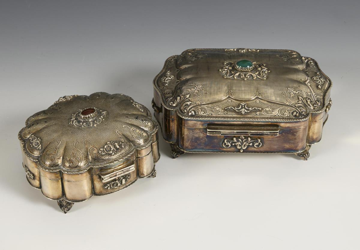 Dekorativ reliefierte und innen vergoldete Schatullen. 1x rechteckig mit grünem Cabochon (7,5 x 15,5 x 11,5 cm), 1x oval mit rotem Cabochon (7 x 11 x 10 cm).