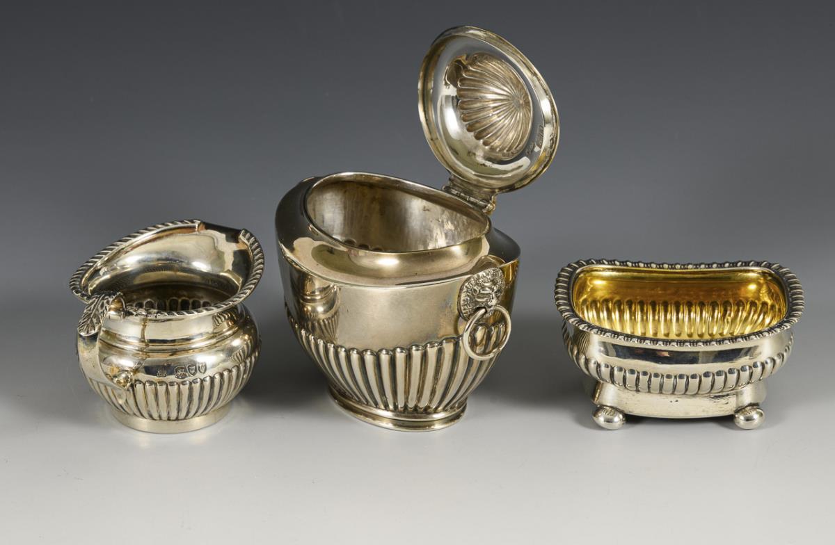 Zuckerdose, Milchkännchen und Schälchen, jeweils mit teilgeripptem Korpus.