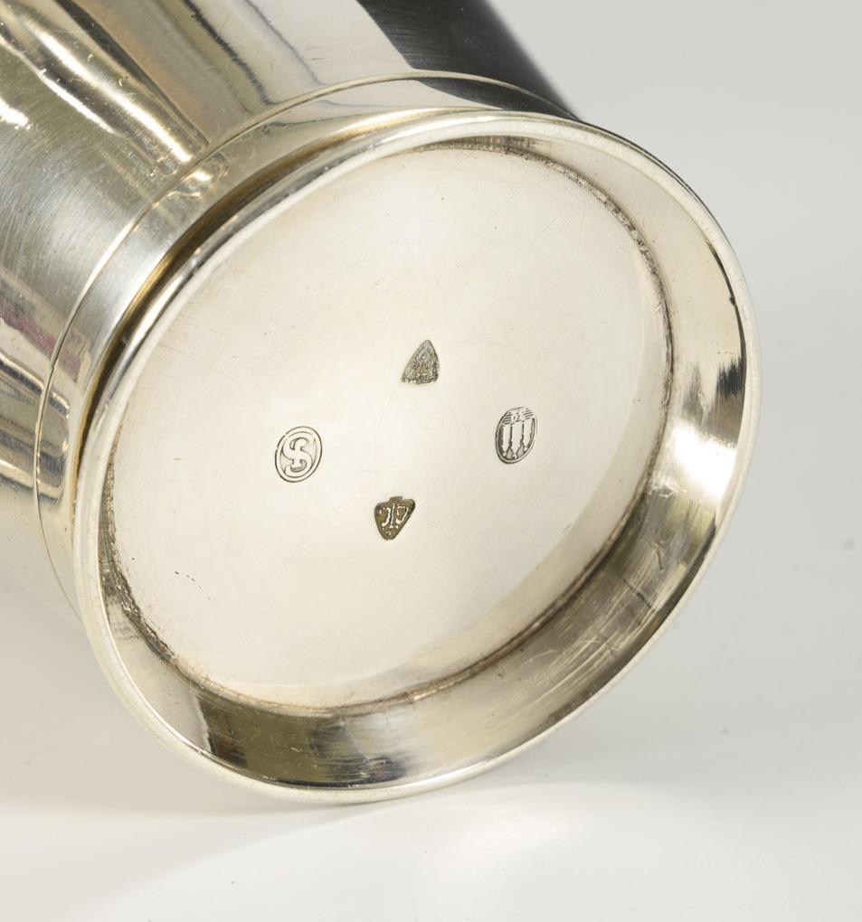 Jeweils glatte Form, darunter eine handgetriebene Jugendstilschale. Leuchter und Becher gedellt.