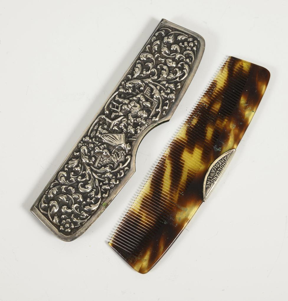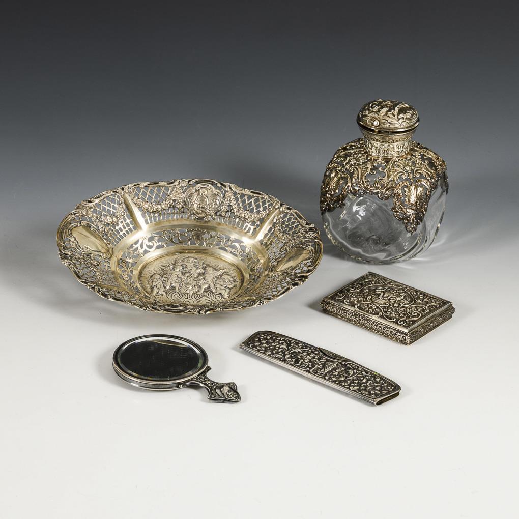 Glasflacon, ovale Silberschale mit Putten, Silberdose, Kamm der "Holland-America-Line" und passender kleiner Spiegel.