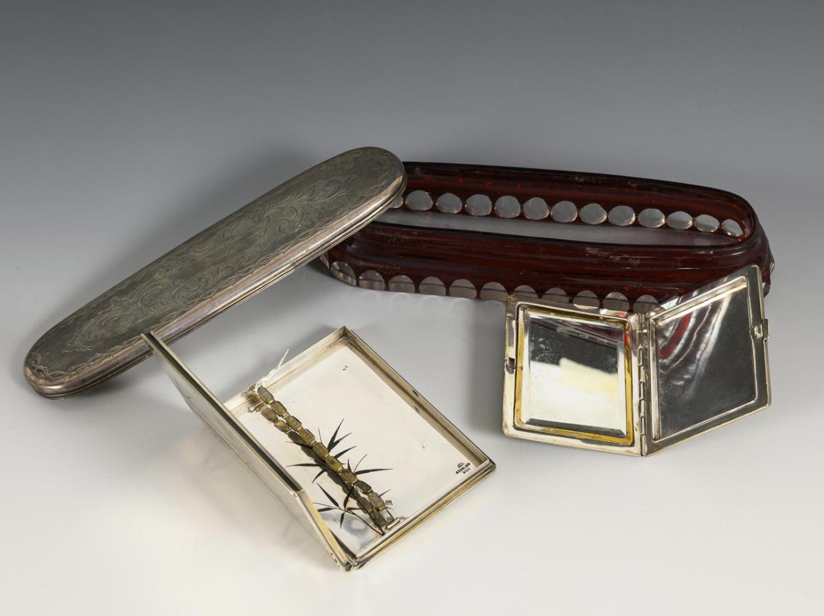 Rot gebeizte Kammdose mit Silberdeckel, 3 kleine Parfumflacons, 1 Puderdose, 1 Zigarettenetui mit Bambusdekor und 1 versilbertes Etui mit Bernstein. Gebrauchsspuren, kleine Dellen.