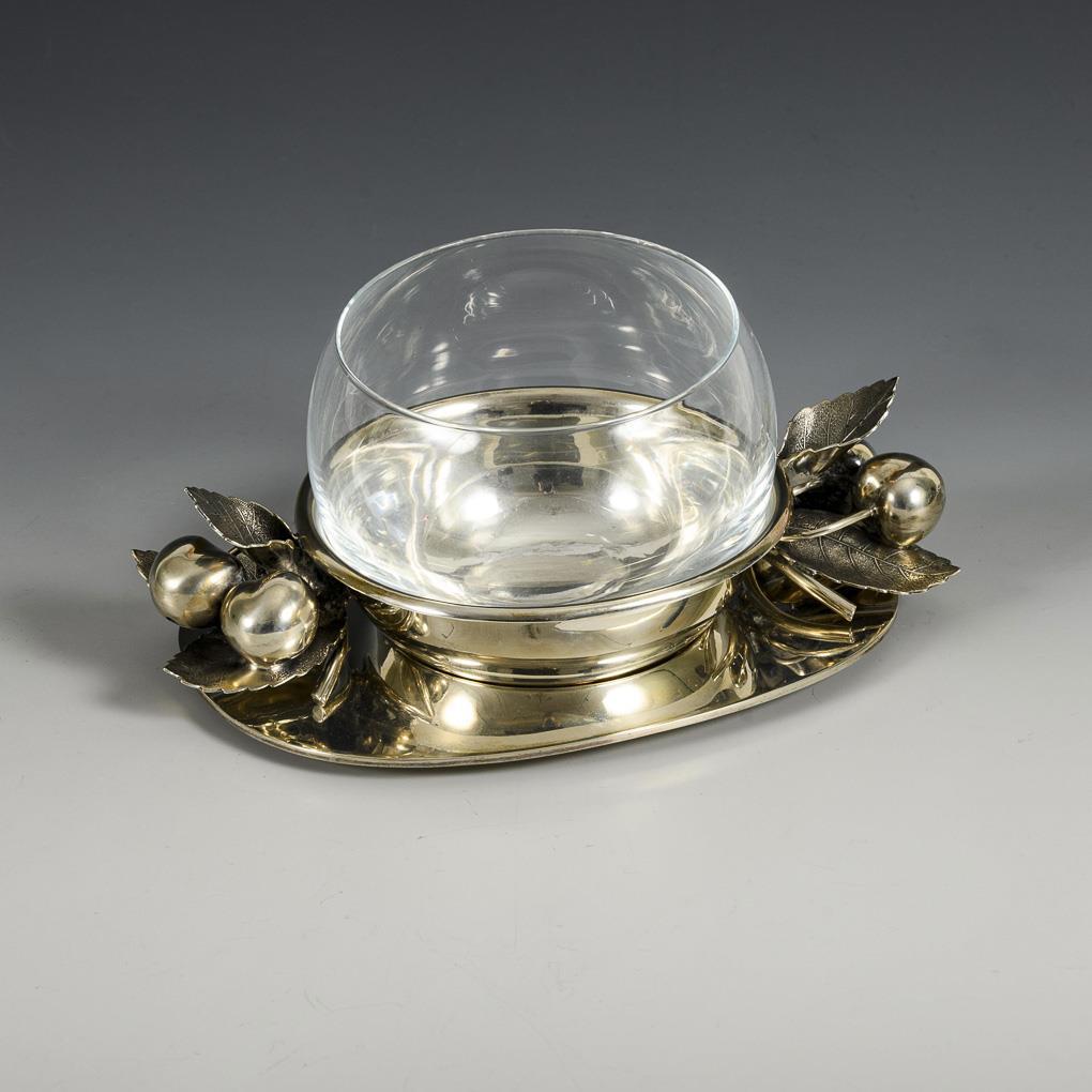 Bauchiges Glasgefäß, Silberschale mit plastischen Kirschen als Handhaben und kleines ovales Silbertablett.