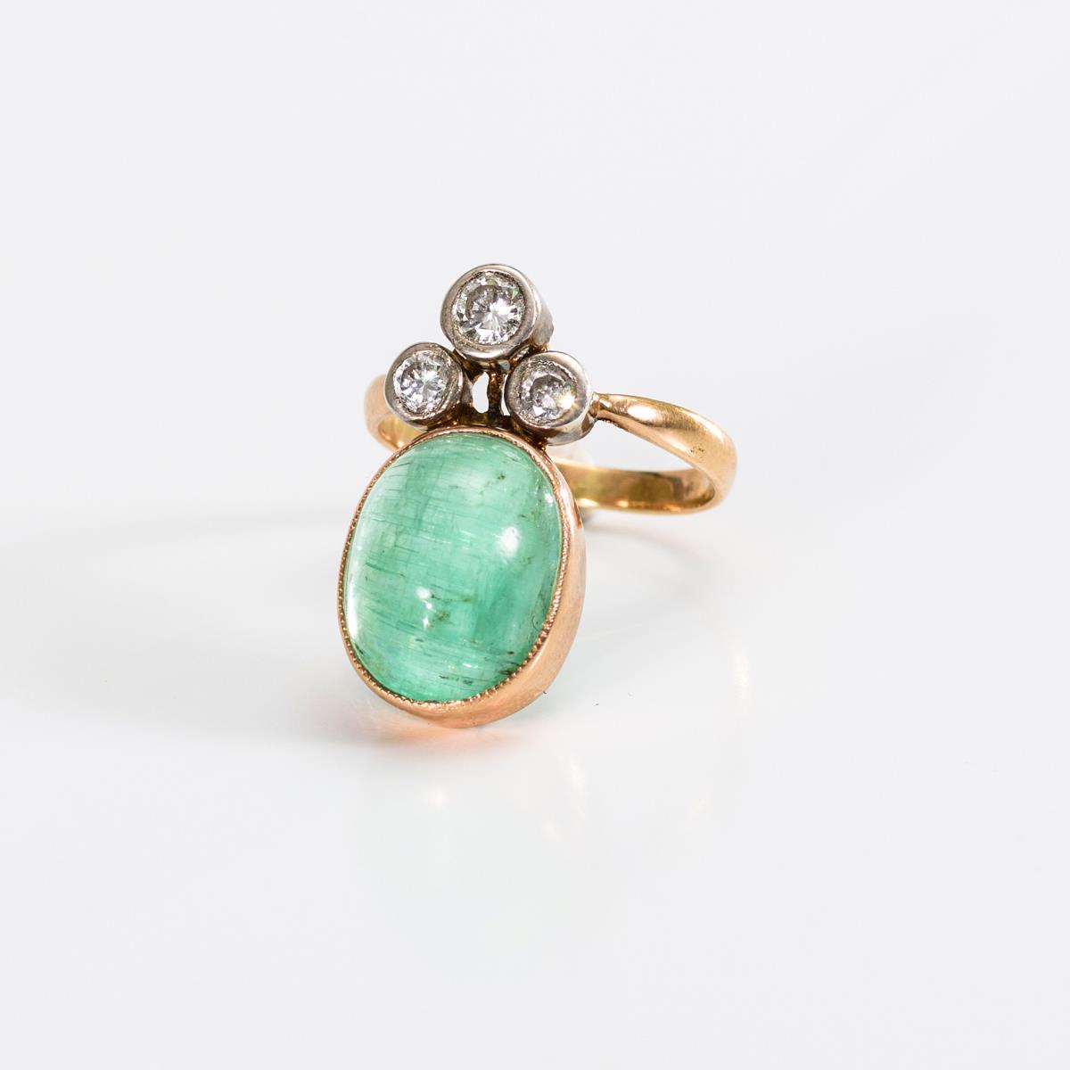 Großer, zargengefasster Cabochon und 3 Brillanten, zwischen schmaler Schiene.