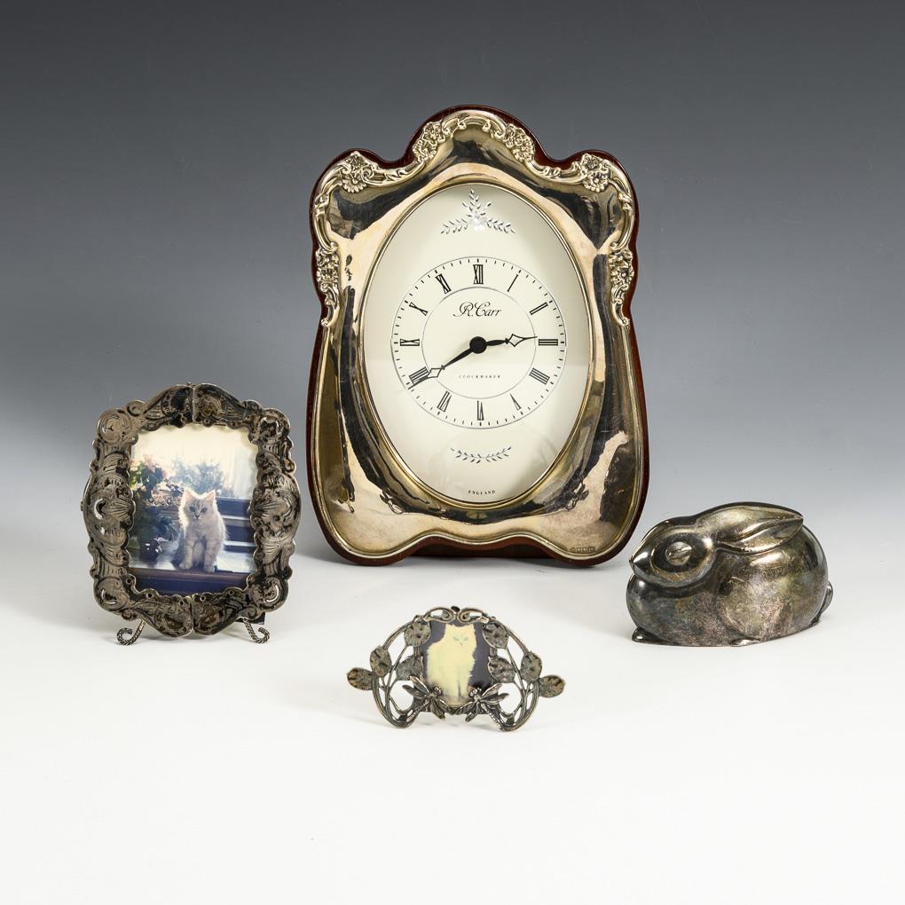Elegante Uhr "R. Carr" mit Silberauflage. Batteriebetrieb, läuft. H 20 cm. / 2 Silber?rahmen, 1x in durchbrochen gearbeitetem Jugendstil-Design. H 5,5/10 cm./ WMF-Spardose in Form eines sitzenden Häschens. 1 Schlüssel anbei. 5,5 x 9 x 4,5 cm. 1 Rahmen mit Defekten.