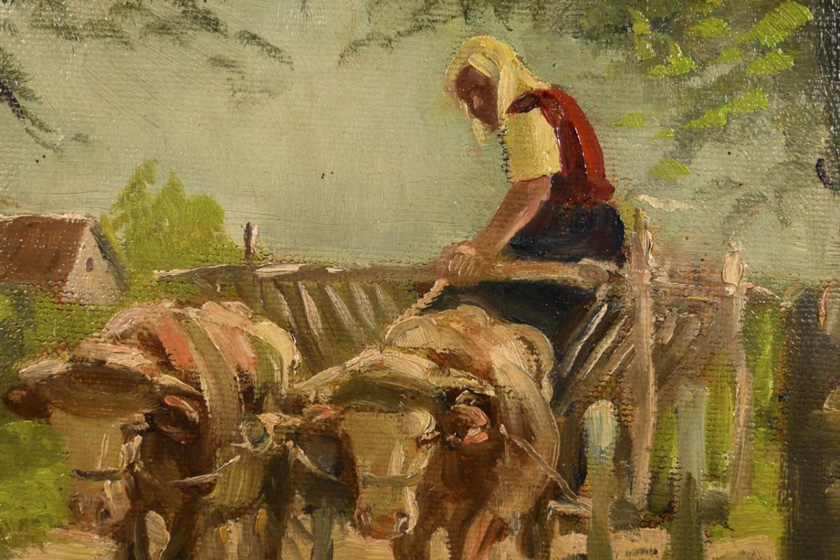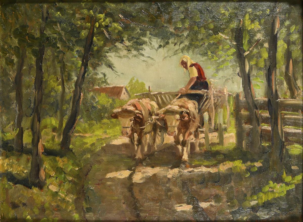 Bäuerin und Ochsen auf dem Heimweg