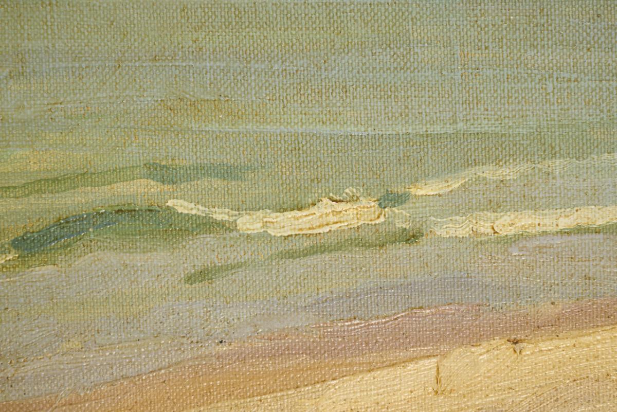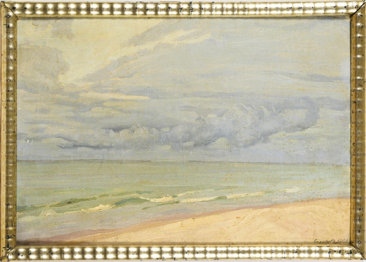 Blick vom Strand übers Meer zum Horizont unter wolkigem Himmel. Leichte Altersspuren.