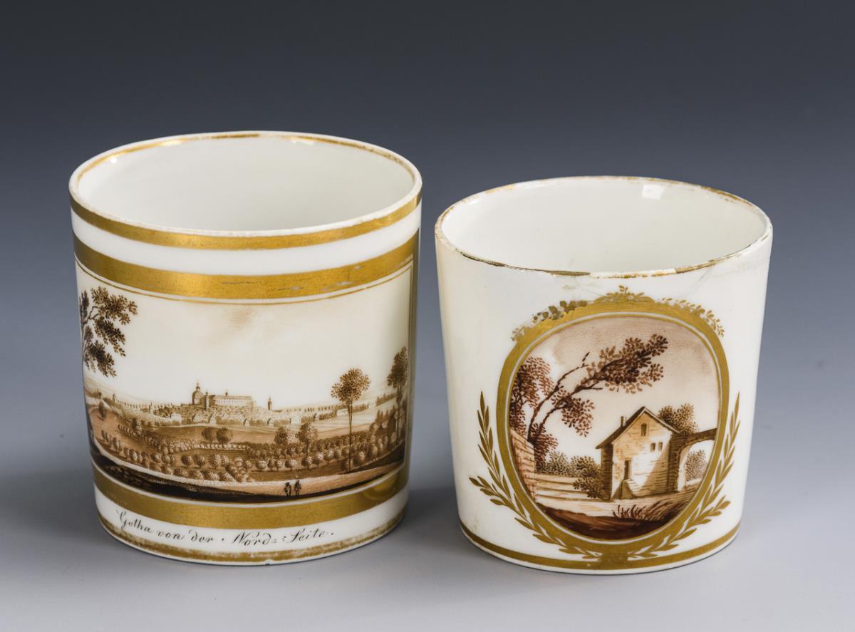 1x Zylindertasse und originale Untertasse: purpurfarbene Bordüre mit schwarzem Mäanderband. / 1x Zylindertasse mit der sepiagemalten, bezeichneten Ansicht von Gotha. / 1x leicht konische Tasse mit sepiafarbener Landschaftsmalerei in einem schauseitigen, goldgerahmten Medaillon. Partieller Goldabrieb, 1 Henkel geklebt.