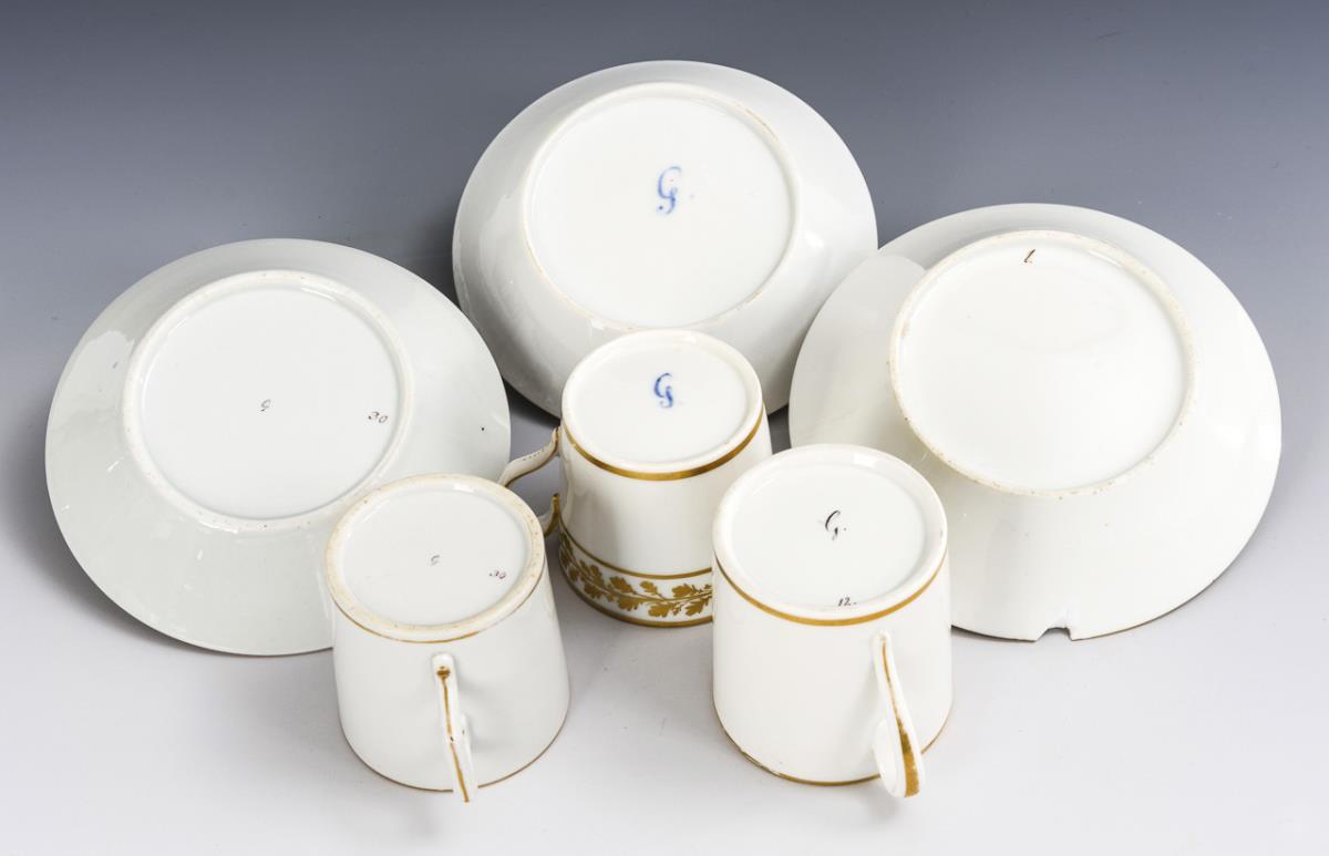 Polychrom bemalt, goldstaffiert. 3 Tassen (H 6-6,5 cm), 3 Untertassen (Ø 12,5-13,5 cm).