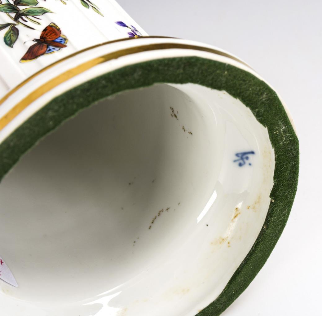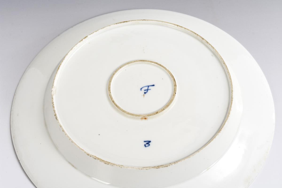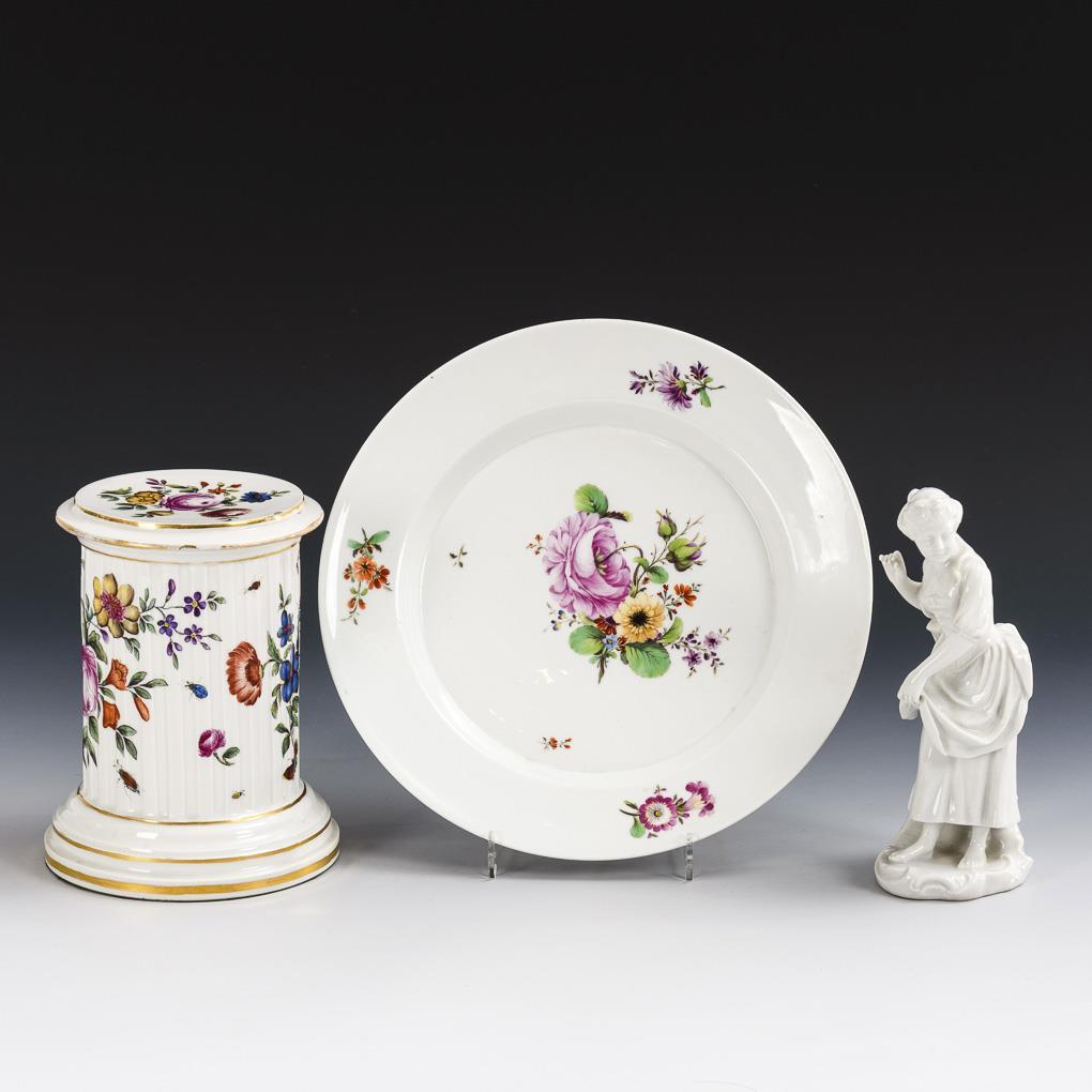 1x F-Marke, 1790-1820: säulenartiger, kannelierter Sockel mit Blumenmalerei (H 16 cm). / 1x F-Marke, 1770-1790: Speiseteller mit Blumenmalerei (Ø 14,5 cm). / 1x F-Marke und Prägemarke "A.a.M." (= aus alten Modellen), 1906-1918: Figur eines Rokokomädchens (H 17,5 cm). 3 Bestoßungen am Rand des Sockels, Bestoßung am Standring des Tellers.