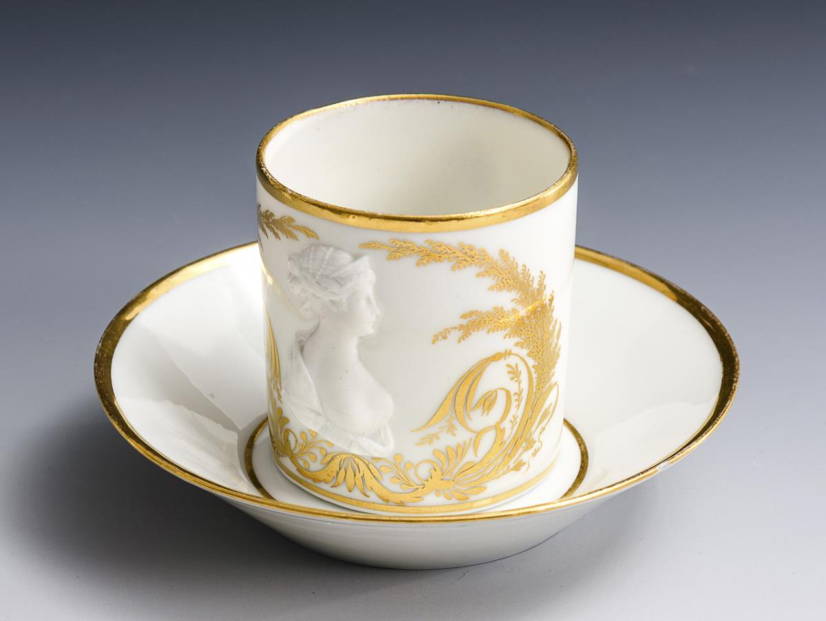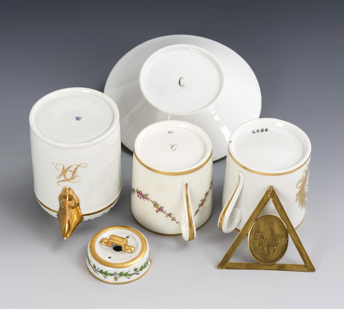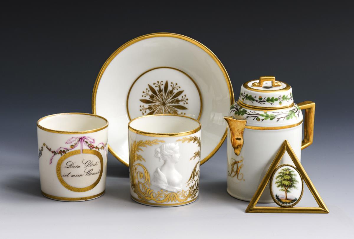 1x ungemarkt: Zylindertasse mit dem schauseitigen, von goldenen Zweigen gerahmten Biskuitrelief der Königin Luise (H Tasse 6,5 cm, Ø originale Untertasse 13 cm). / 1x Gotha: Zylindertasse mit Blütenfestons und dem schauseitigen Spruch "Dein Glück ist mein Wunsch" (H 6,5 cm). / 1x Wallendorf: Zylinderkännchen mit gewinkeltem Henkel und Eichenzweigbordüre (H 10,5 cm). / 1x kleine ovale Plakette mit der Darstellung eines Baumes, eingefasst in einen dreieckigen Messingrahmen, verso die Datierung "d. 3. Februar 1847.". Bestoßung und Haarriss am Untertassenrand, 1 Tasse restauriert, Bestoßung an der Schneppe und am Stand des Kännchens.