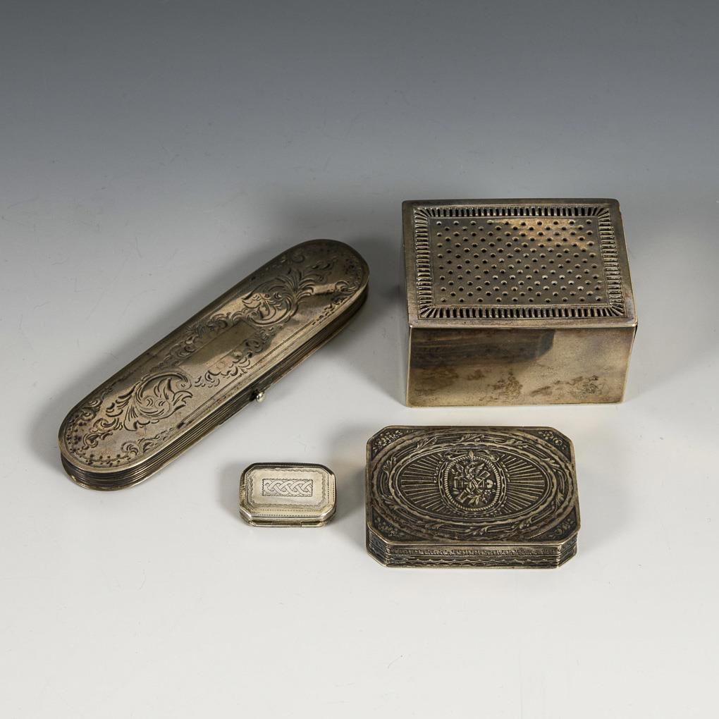 Große Riechdose (Wien 1807, Meister Friedrich Wirth). / Kleines englisches Riechdöschen (Steuerstempel King George III, 1786-1821). / Niederländisches Brillenetui mit alter Brille. / Reliefiertes Döschen. Teils mit Defekten.