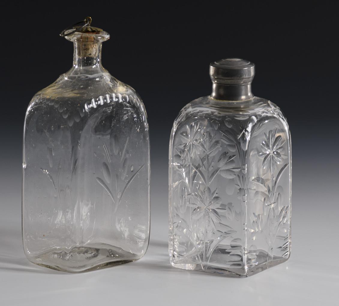 Vierkantflaschen mit Kerb-, Linsen- und Olivenschliff, 1x mit Stopfen und 1x mit jünger montiertem Zinnschraubverschluss (H 15 cm). / 1 konischer Becher mit fein graviertem Rankenwerk (H 11,5 cm). 1x Spannungsriss am Hals, 1x Bestoßung an 1 Schliffkante.