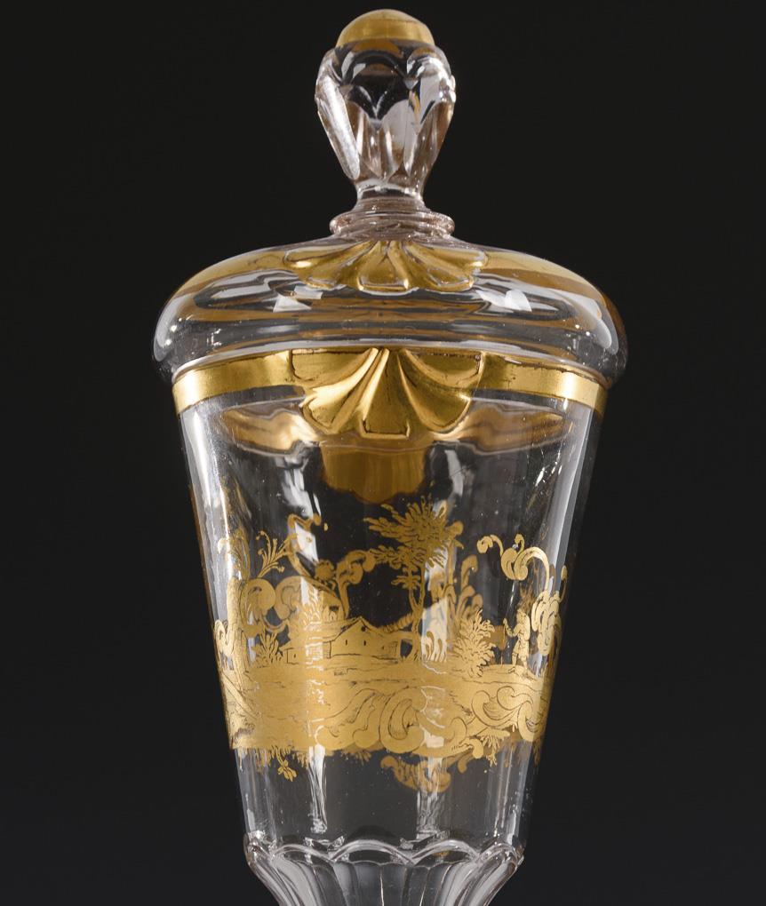 Kelchglas mit konischer, am Ansatz facettierter Kuppa, wabenfacettiertem Nodus, Rundfuß und Knaufdeckel. Umlaufend eine goldgemalte Landschaft mit Rocaillen, Architektur sowie Personen- und Tierstaffage. Minimaler Goldabrieb, 2 kleine Bestoßungen am Innenrand des Deckels.