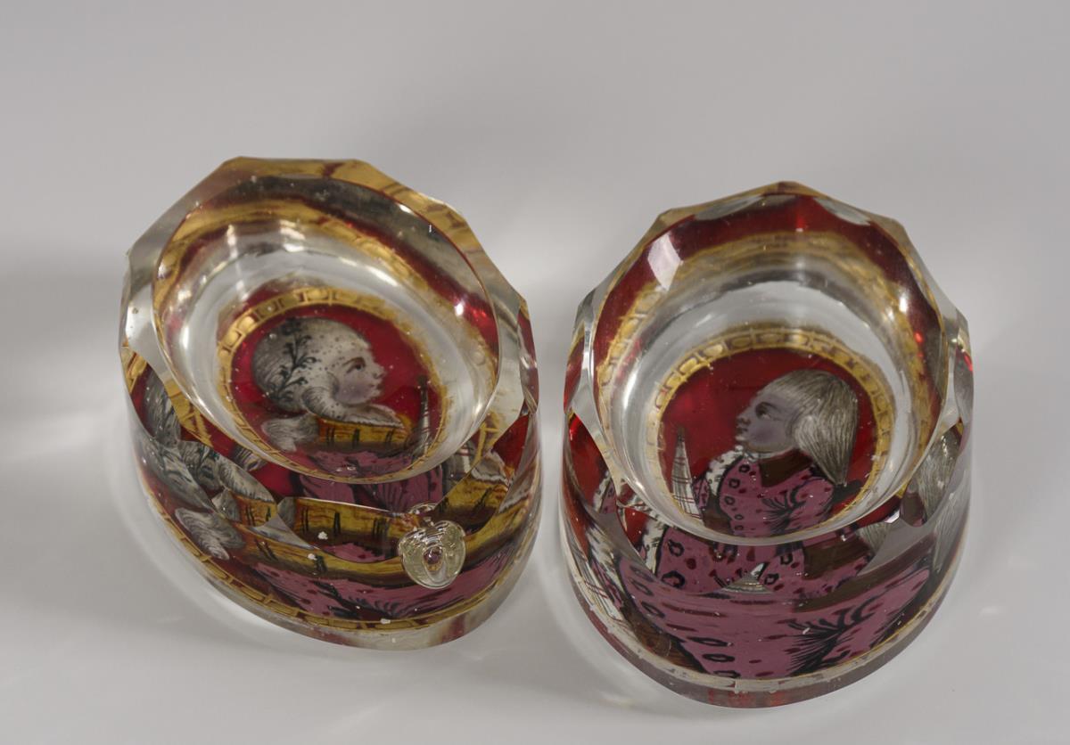 Farbloses Glas, polychrome Emailmalerei, Goldfolie.
