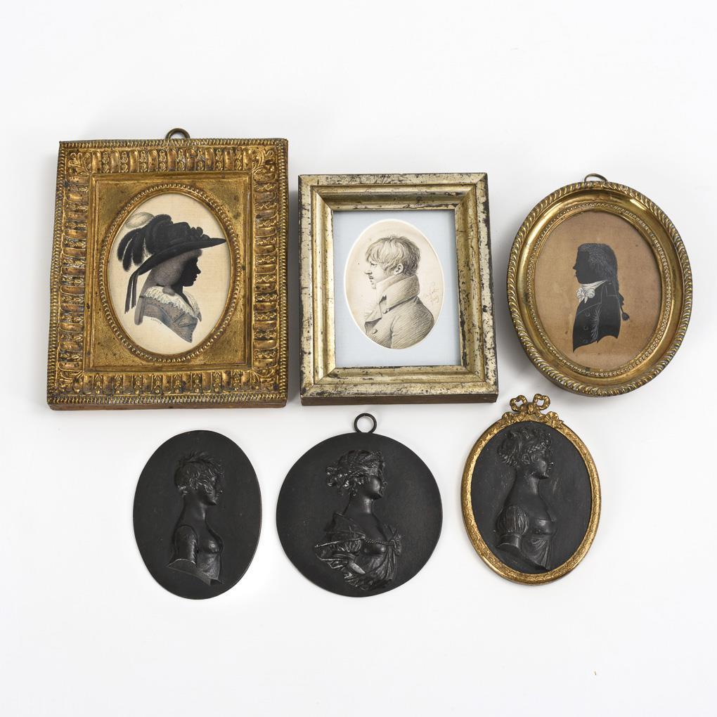 3 Silhouetten und 3 Eisenguss-Bildnismedaillons.