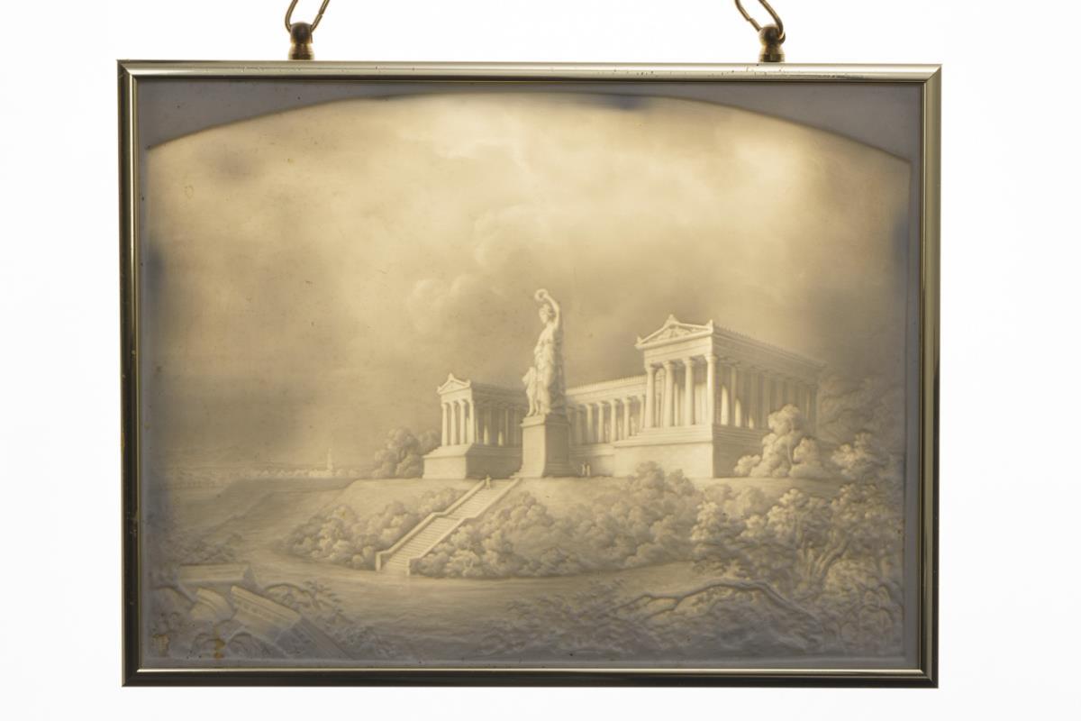1x Nymphenburg mit der Darstellung der Ruhmeshalle an der Theresienwiese in München (17,5 x 25,5 cm). / 2x ungemarkt: 1x mit der bezeichneten Darstellung des Radau-Wasserfalles bei Bad Harzburg und 1x mit der Darstellung eines jungen Bauernpaares (je 13 x 11 cm). 1x 2 Ecken bestoßen, feiner, nicht sichtbarer Brandriss in der Nymphenburg-Platte.