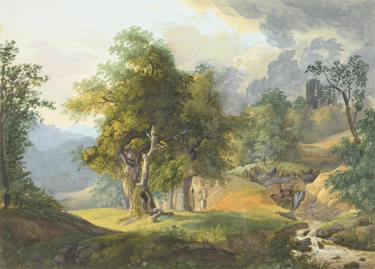 Schäfer und Frau mit Kiepe unter großen Bäumen in romantischer Landschaft.