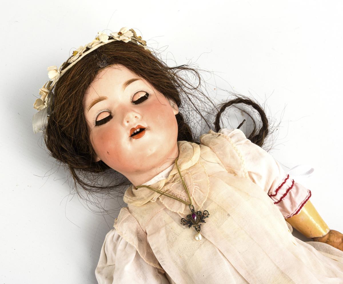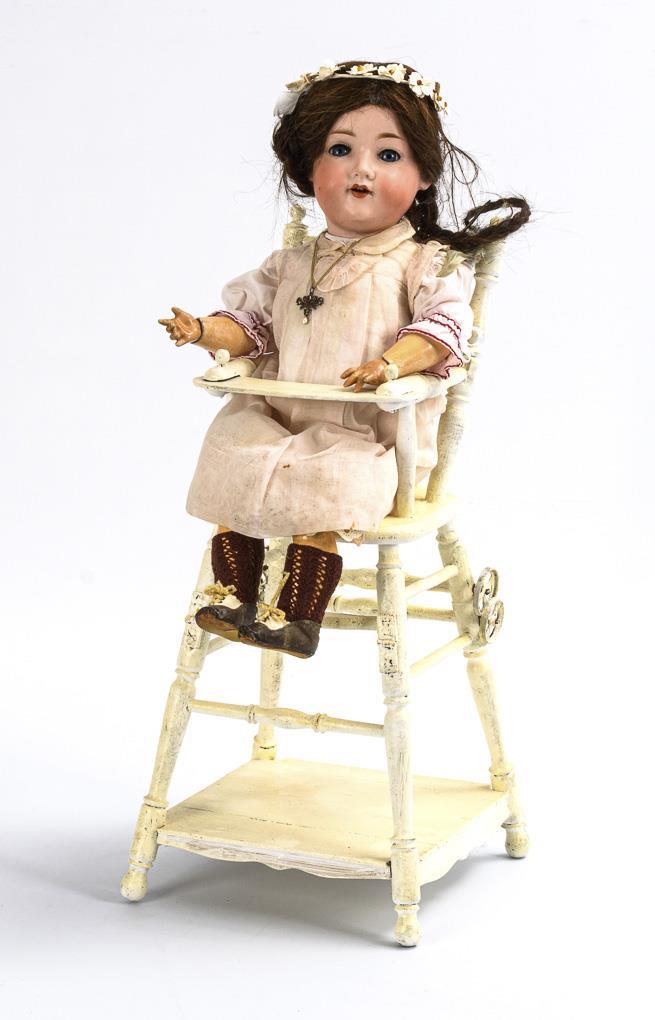 Puppe mit Kurbelkopf, blauen Schlafaugen, Wimpern, brauner Echthaarperücke, 15-teiligem Gliederkörper und zartrosa Kleidchen, L 48 cm. Kopf durchleuchtet: ohne Defekte, Körper mit kleinen Farbdefekten, Hände übermalt (links mit reparierten Fingern). Weiß gestrichener, umklappbarer Hochstuhl mit Drechselstäben. H 30-50 cm.