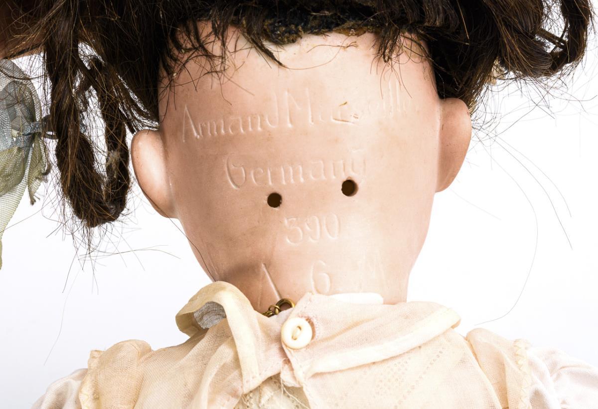 Puppenmädchen und kleiner Hochstuhl. Armand Marseille.