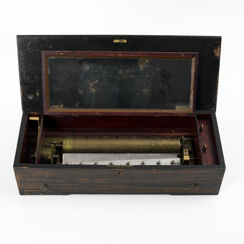 Längliche Quader-"Walzenspieluhr" mit marketiertem Stern auf dem Scharnierdeckel. Innen unter verglastem Scharnierdeckel Spielwerk mit Zungenkamm an der Stiftwalze (mehrere Lieder) sowie steingelagertes Windrad. Neben dem Werk im Kasten Ratschenaufzug und 2 Stellhebel. 1 Scharnierverschraubung des Binnendeckels ausgerissen, Ausstell-Hebel fasst nicht richtig, einige Alters-/Gebrauchsspuren. Spielt mit schönem Klang.