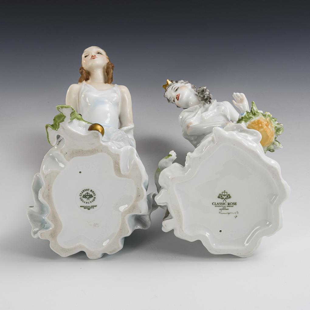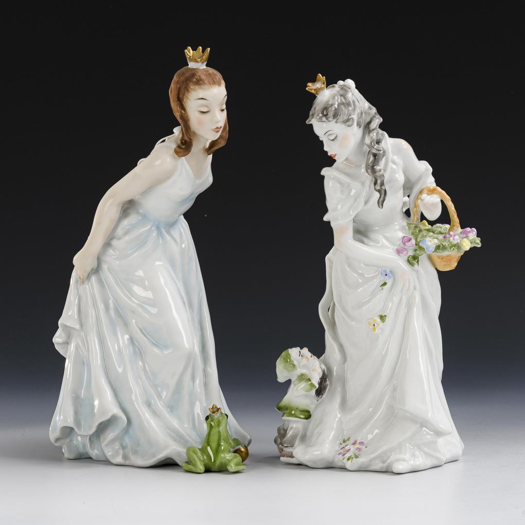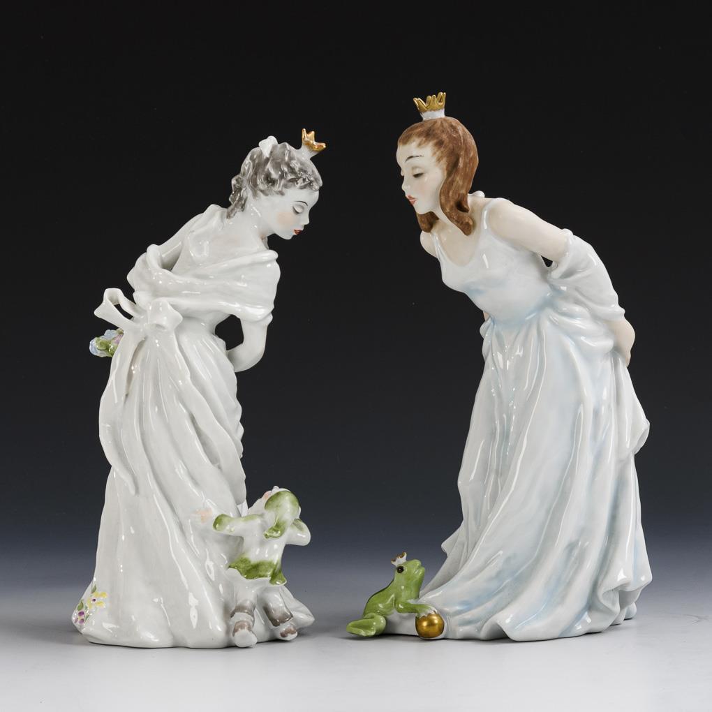 1x Modell-Nr. 1793/2: Prinzessin mit einem Frosch mit goldener Kugel zu ihren Füßen. / 1x Modell-Nr. 5145: Prinzessin mit Blumenkorb, zu ihren Füßen ein Zwerg stehend.
