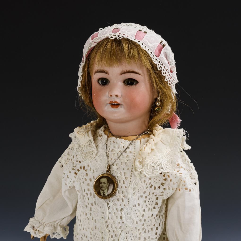 Kurbelkopf, braune Schlafaugen, Wimpern, Ohrringe, mittelblonde Echthaarperücke. 11-teiliger Gliederkörper. Weißes Kleid mit Lochstickerei, passende Haube, weiße Lederschuhe. Kopf durchleuchtet: ohne Defekte, lediglich winziger Chip an der Halskurbel. 4 Finger fehlend.
