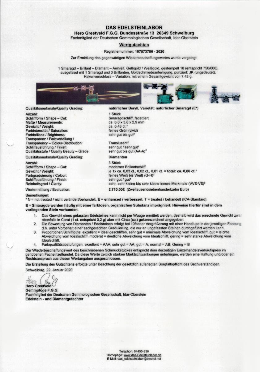 Gelbgold/Weißgold, 18 gestempelt, 750 geprüft, Goldschmiedeanfertigung, punziert JK. Reif Ø 6 cm, Smaragd ca. 0,48 ct/Brillanten zus. 0,06 ct. 7,5 g.