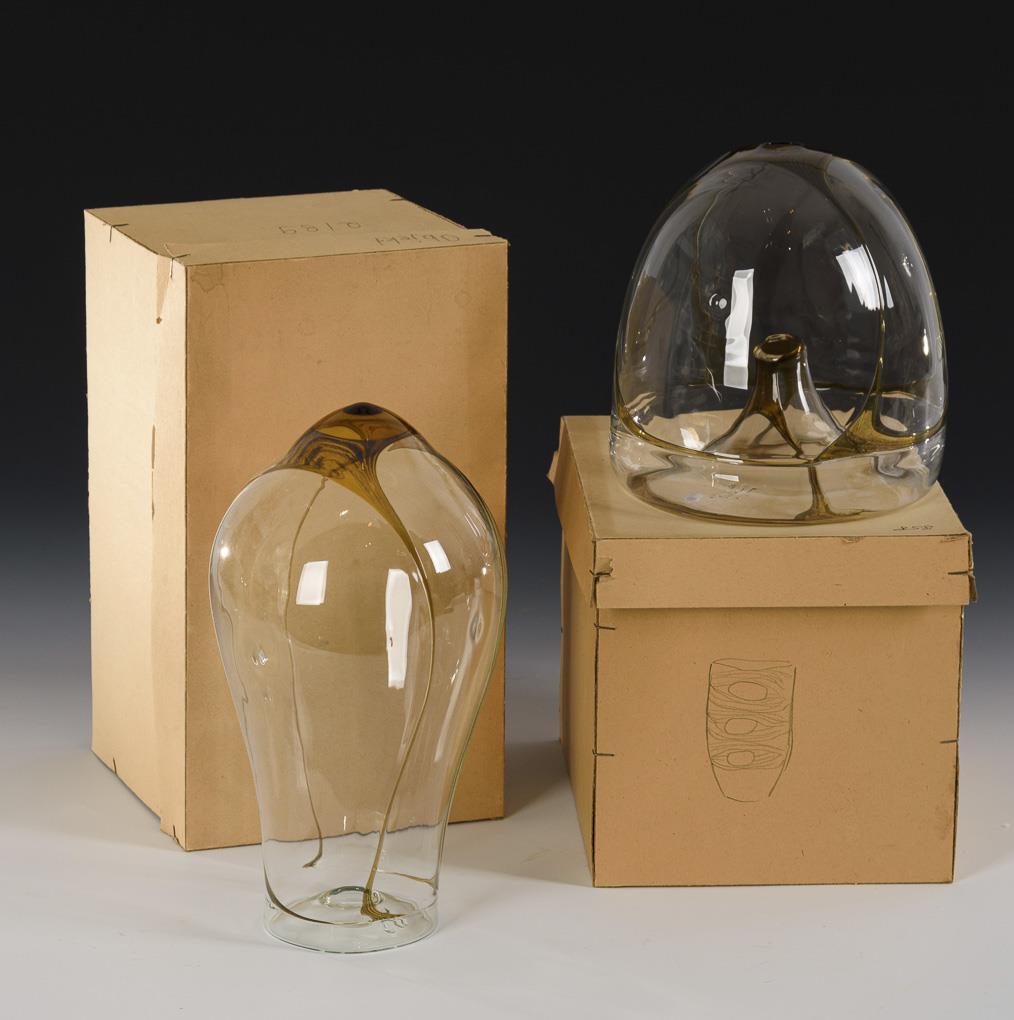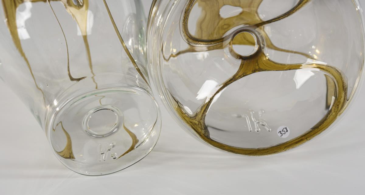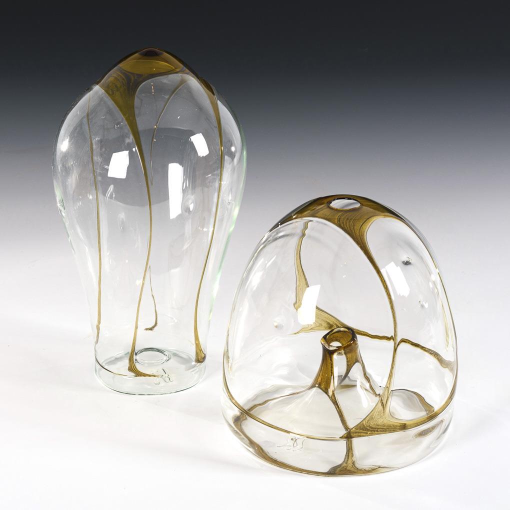 Montiertes und vor der Lampe geblasenes farbloses und honiggelbes Glas, Glasemailaufschmelzung. H 14 und 22 cm.