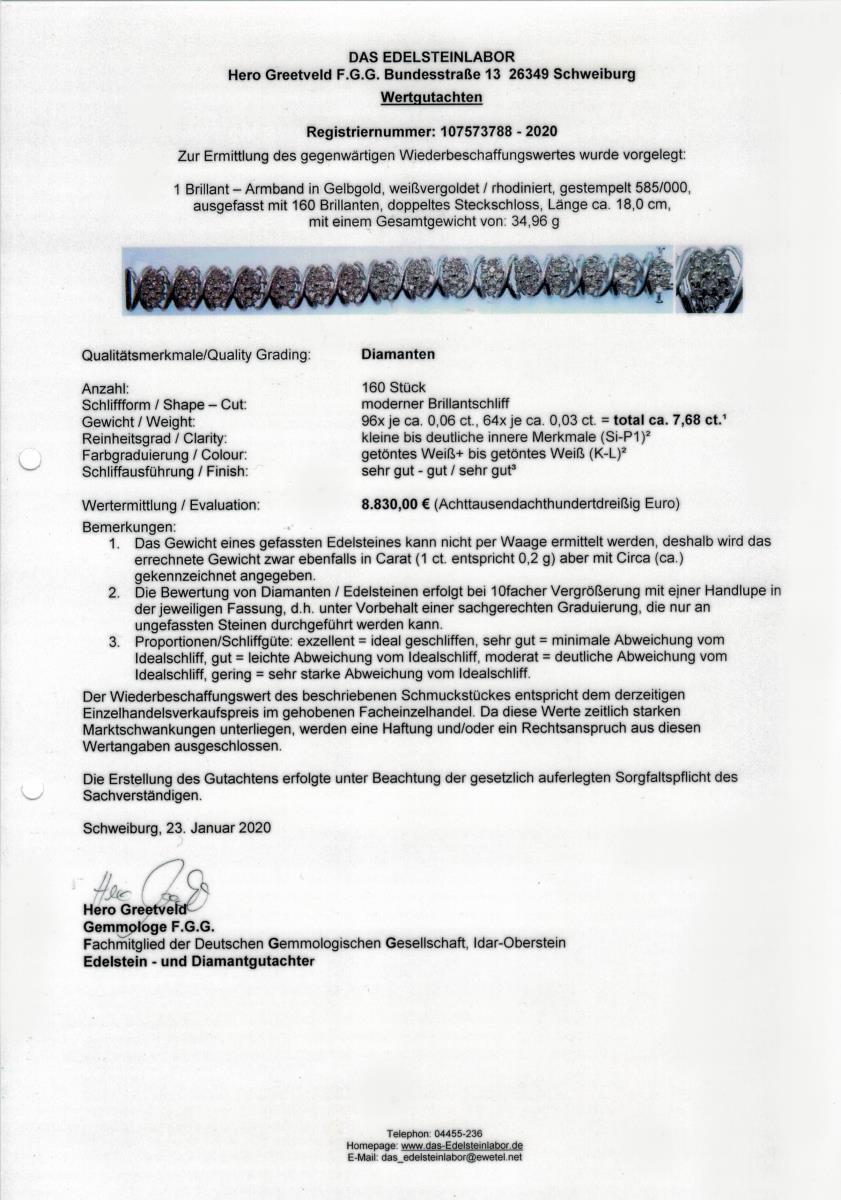 Gelbgold 585 geprüft, weißvergoldet/rhodiniert. Brillanten zus. ca. 7,65 ct/K-L/si-PI. L 18 x 1,5 cm. 34,96 g.