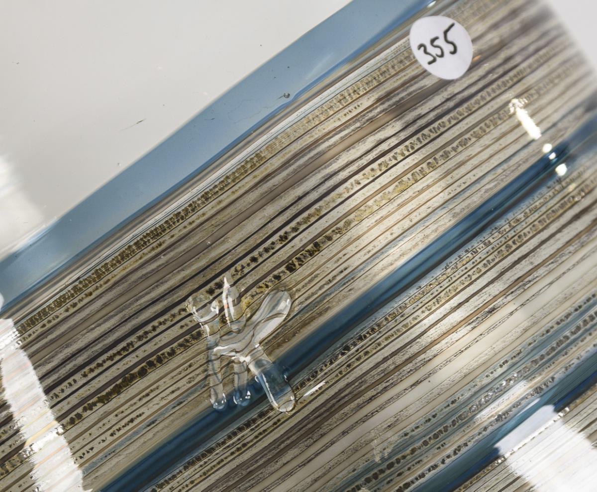 Montiertes und vor der Lampe geblasenes farbloses und blaues Glas, Glasemailaufschmelzung. Vasen (H 16 und 19,5 cm), Glasobjekt (L 16 cm).