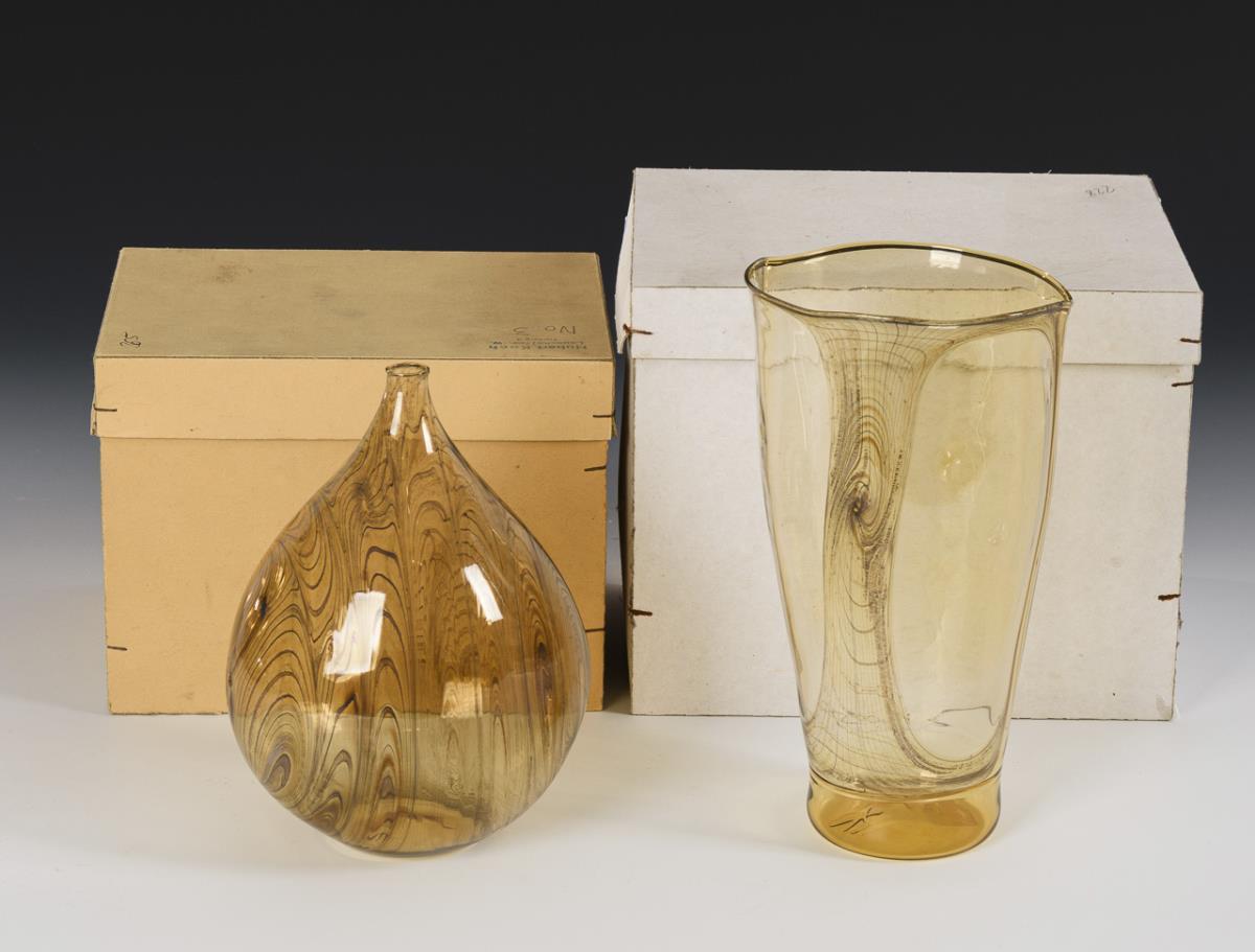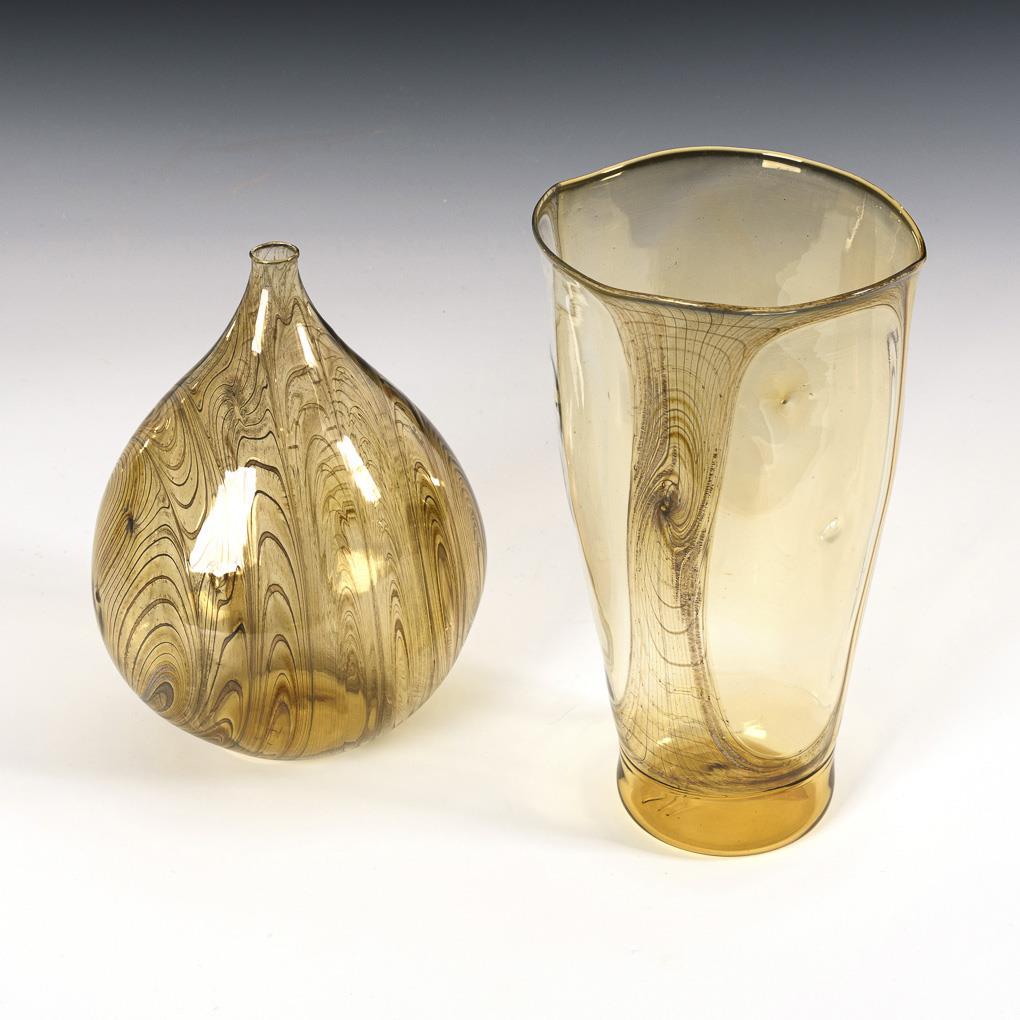 Montiertes und vor der Lampe geblasenes honiggelbes und farbloses Glas, Glasemailaufschmelzung. H 18,5 und 22 cm.
