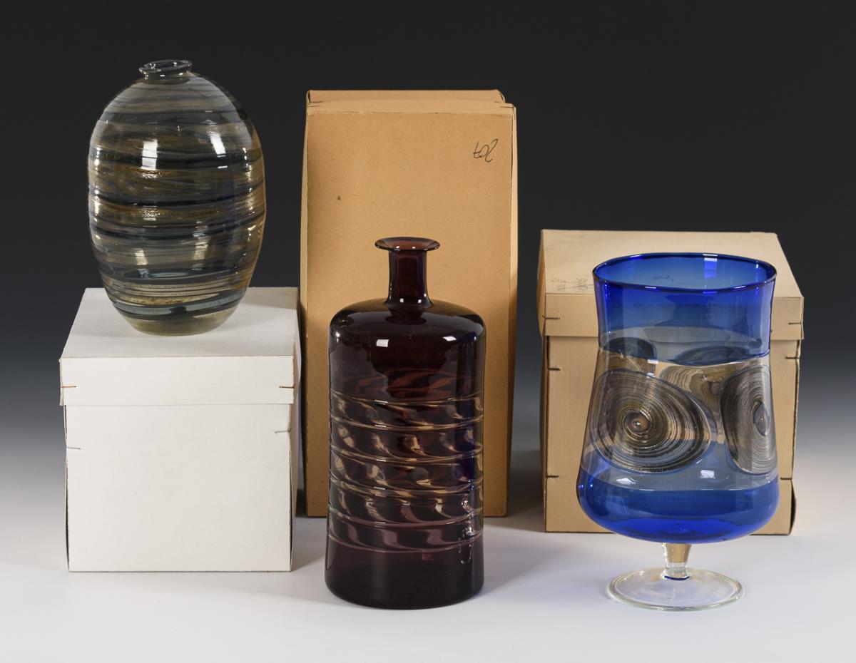 1x Zylinderflasche aus violettem und farblosem Glas (H 20,5 cm). / 1x Fußvase aus farblosem und blauem Glas (H 19 cm). / 1x Vase aus farblosem und blauem, streifig montiertem Glas (H 16 cm).
