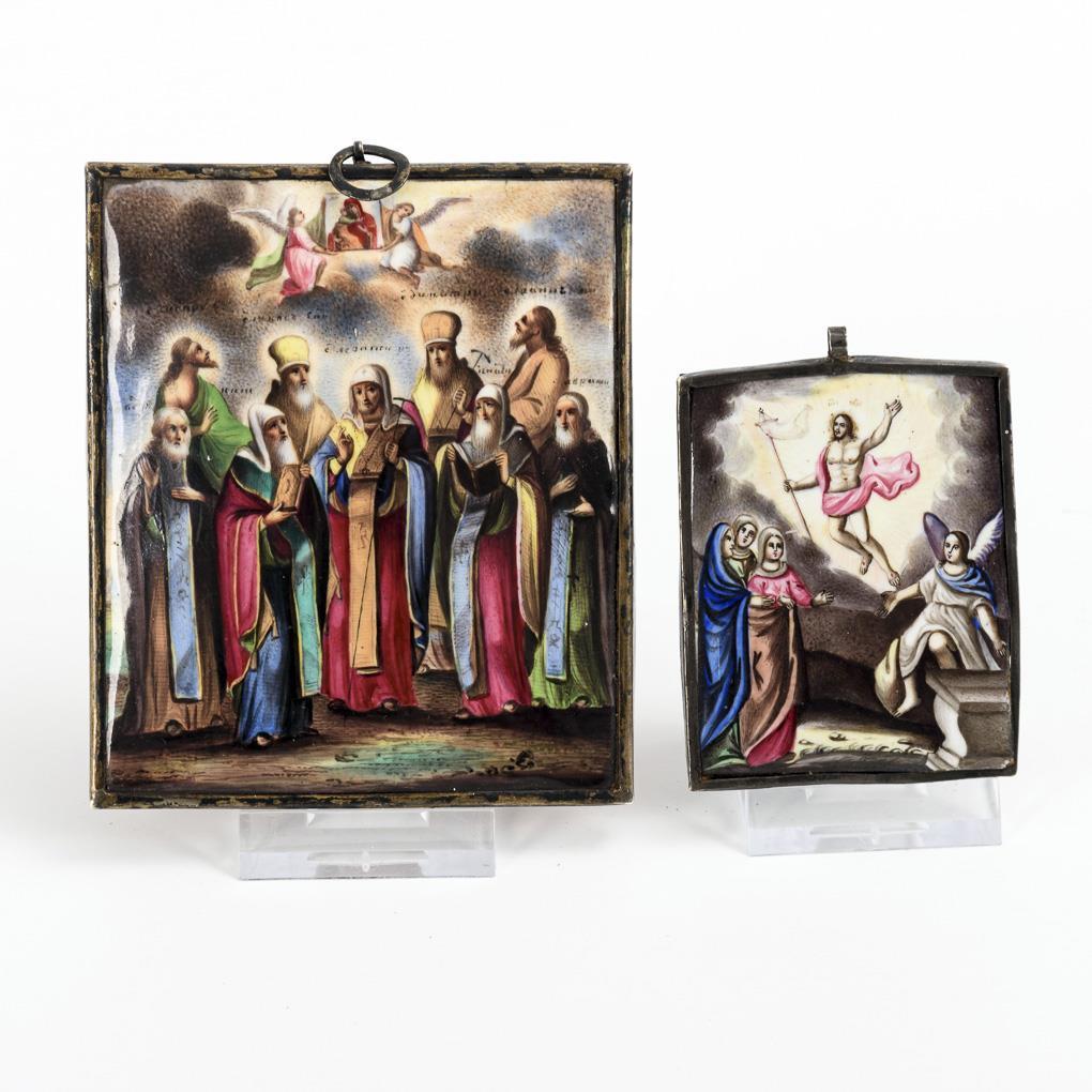 2 Ikonen-Anhänger: Auf dem größeren 9 kyrillisch beschriftete Heilige unter der von Engeln getragenen Madonnenikone im Himmel. / Kleiner Anhänger: Auferstehung Christi. mit Resten einer geringen Goldstaffierung, verso auf gesonderter Emailtafel kyrillische Erläuterung. Minimale Alters-/Gebrauchsspuren.