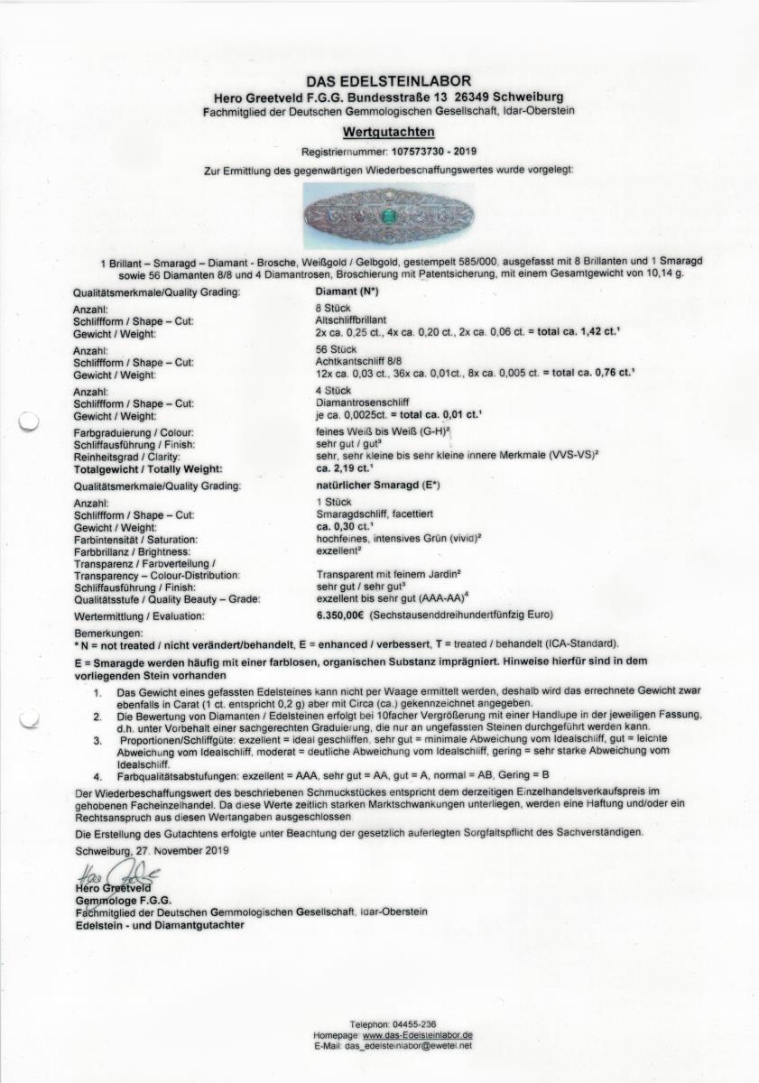 Gelbgold/Weißgold 585 gestempelt. 5,2 x 1,8 cm, Brillanten zus. ca. 1,42 ct. 8/8 Diamanten zus. 0,76 ct/G-H/vvs-vs. Smaragd ca. 0,30 ct. 10,14 g.