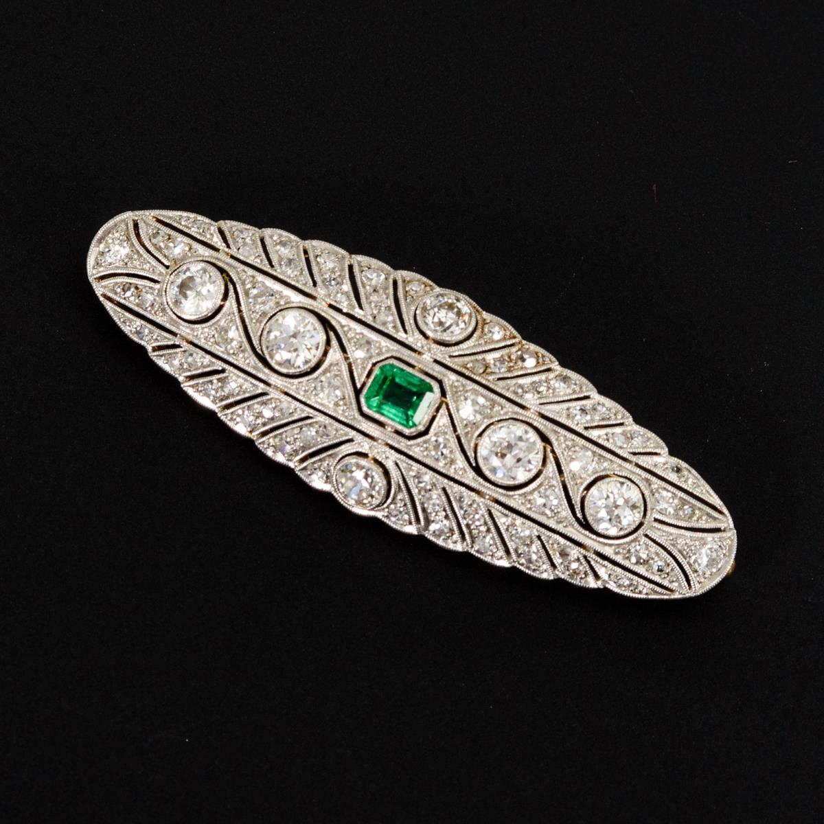 Art-déco-Brosche mit Altschliff-Brillanten, Diamanten und Smaragd .