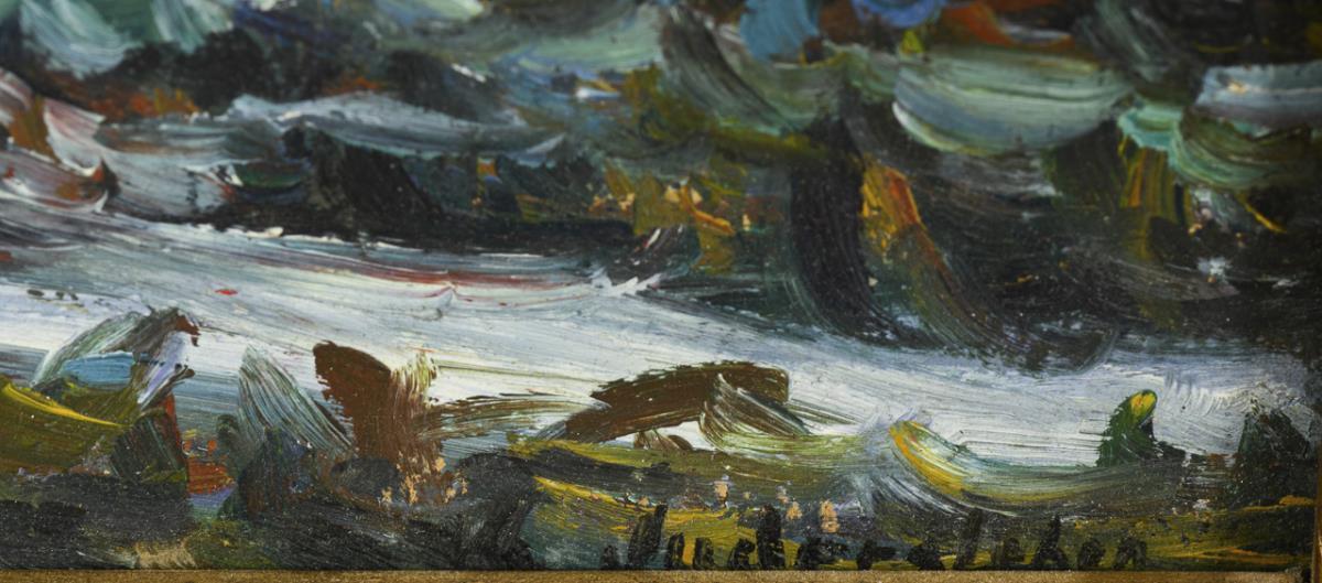 Expressiv gemalte Häuser zwischen Bäumen unter grauem Himmel.