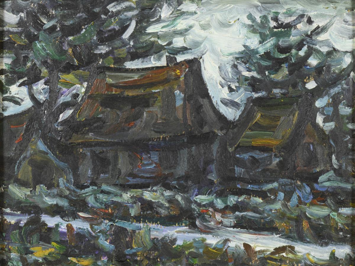 Expressiv gemalte Häuser zwischen Bäumen unter grauem Himmel.