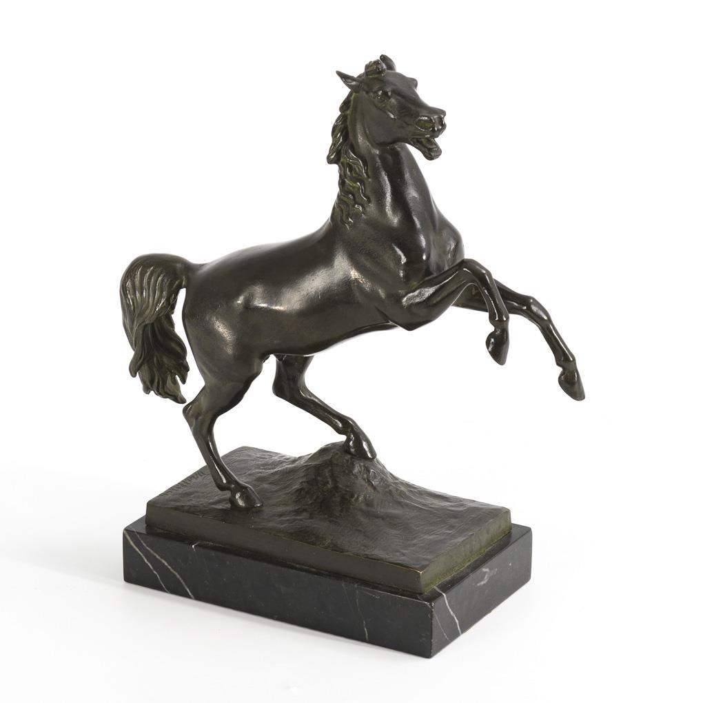 Bronze patiniert, schwarzer Marmor-Sockel. Bezeichnet. H 24,5 cm, gesamt 27,5 x 23 x 11 cm.