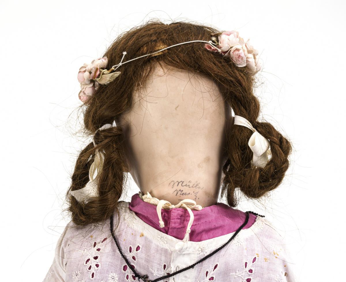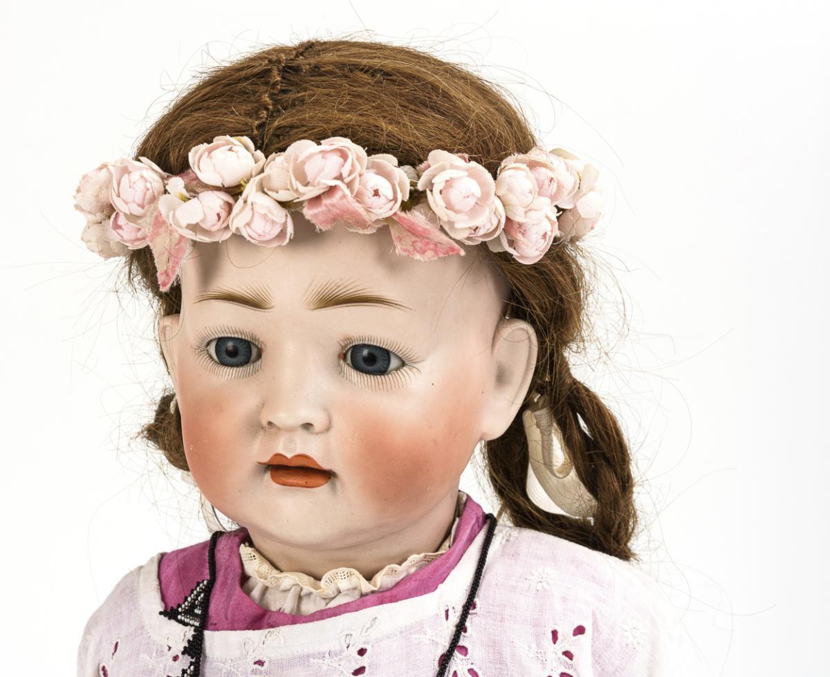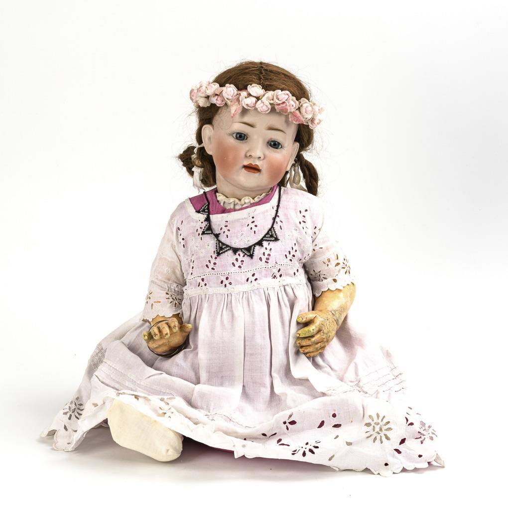 Ausdrucksvoller Kurbelkopf mit geschlossenem Mund, fest nachgegipste blaue Glasaugen, braune Echthaarperücke mit kleinen Kahlstellen. 5-teiliger Sitzbabykörper. Weißes Kleid mit Lochstickerei über rosa Unterkleid, Blütenkranz im Haar. Kopf durchleuchtet: ohne Defekte, lediglich minimaler Perückenpull. Körper mit kleinen Defekten, Finger repariert.
