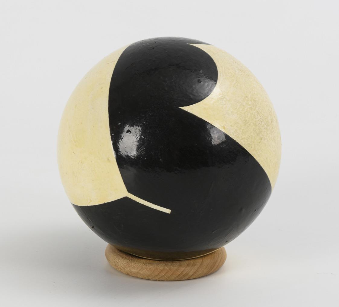 Die kontrastreiche Bemalung verschmilzt streng geometrische und organische Formen, was durch die Kugelkrümmung verstärkt wird. Lack leicht vergilbt, Standring ergänzt.
